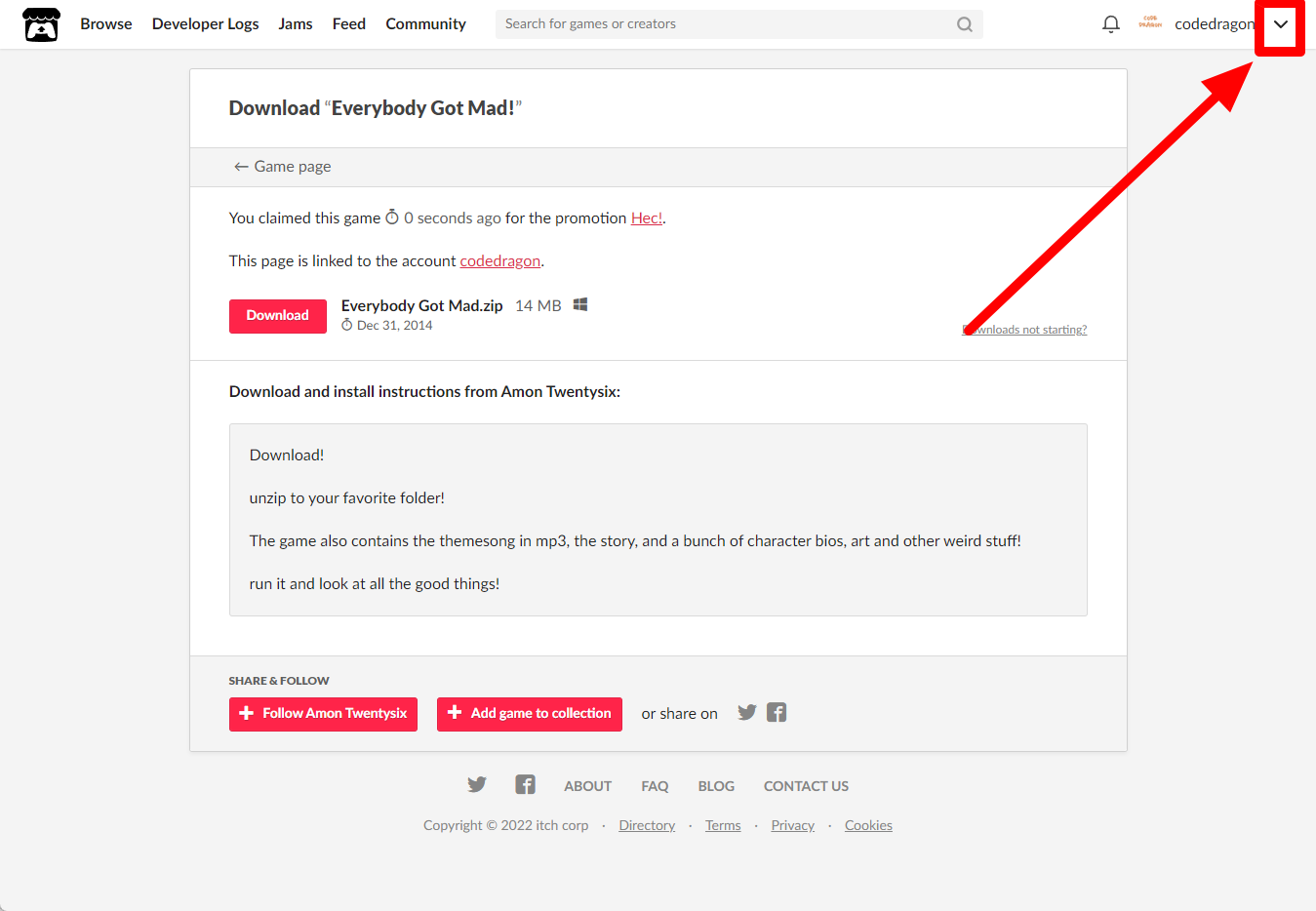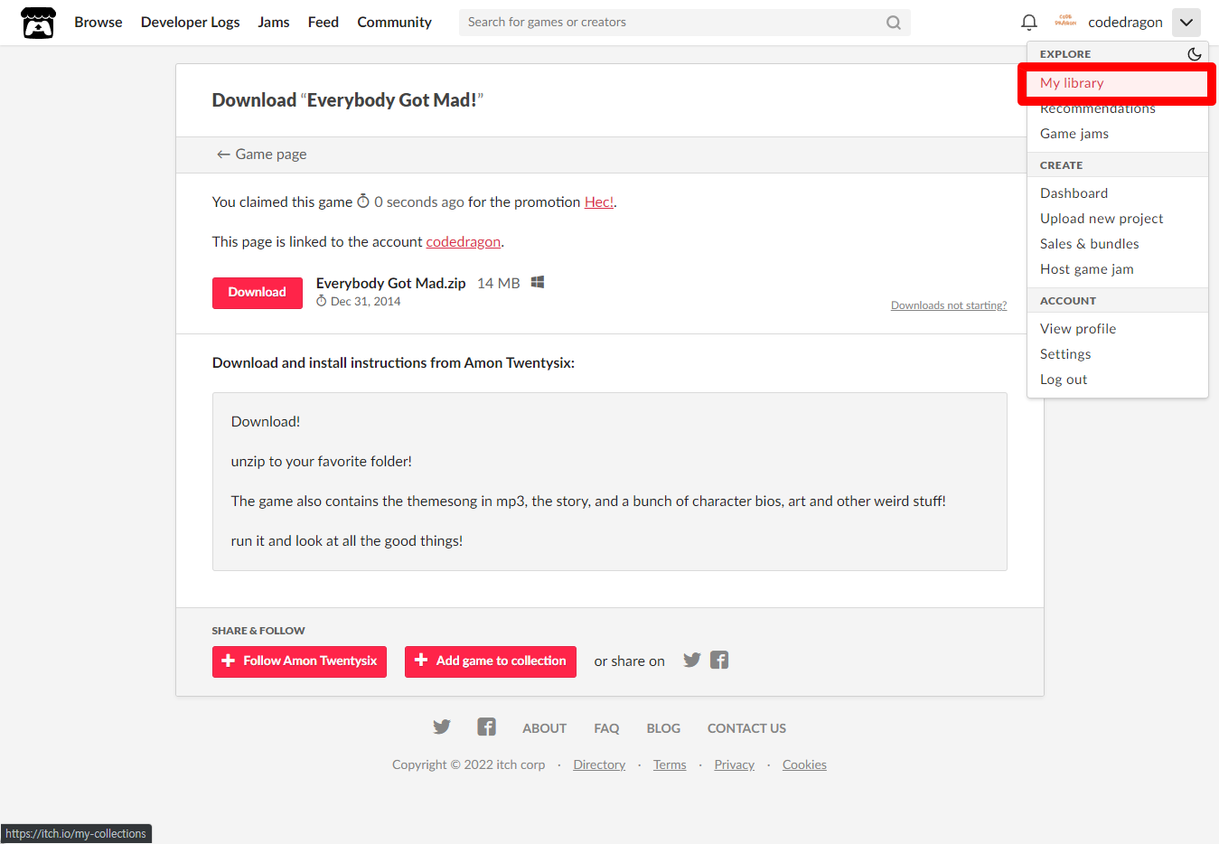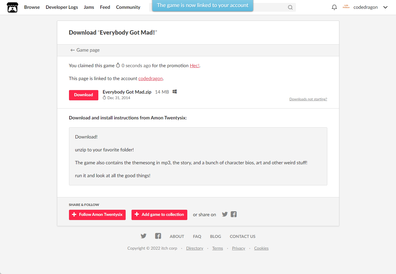 [Claim game]을 클릭하면 "Everybody Got Mad!" 게임이 나의 게임 라이브러리에 추가되고 설치파일을 다운받을 수 있는 페이지로 이동됩니다.