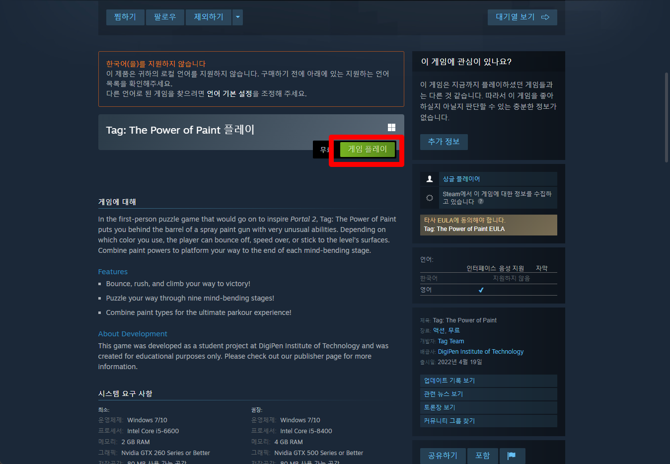 "Tag: The Power of Paint" 페이지를 내려 [게임 플레이]를 클릭하면 됩니다.