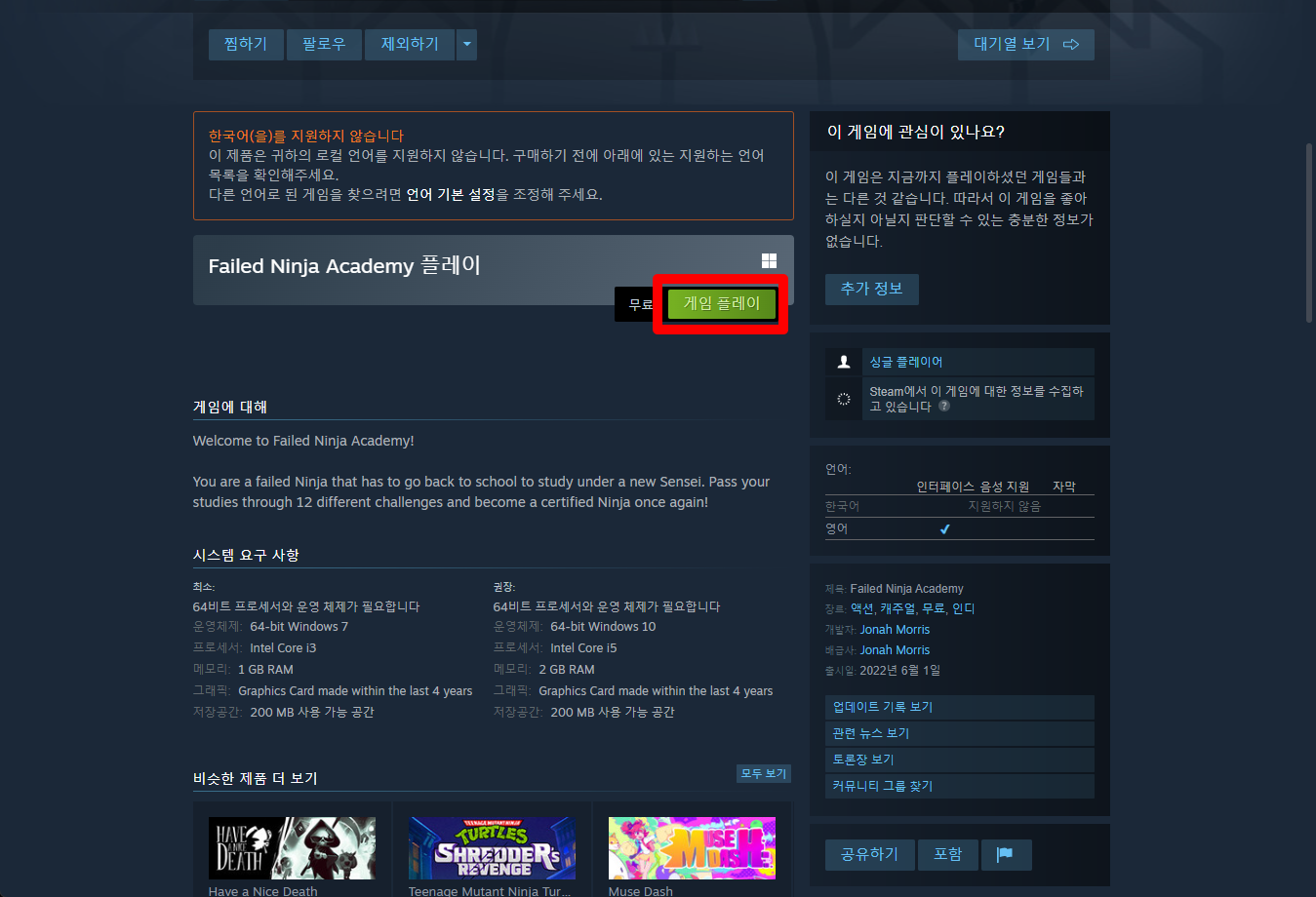 "Failed Ninja Academy" 페이지를 내려 [게임 플레이]를 클릭하면 됩니다.