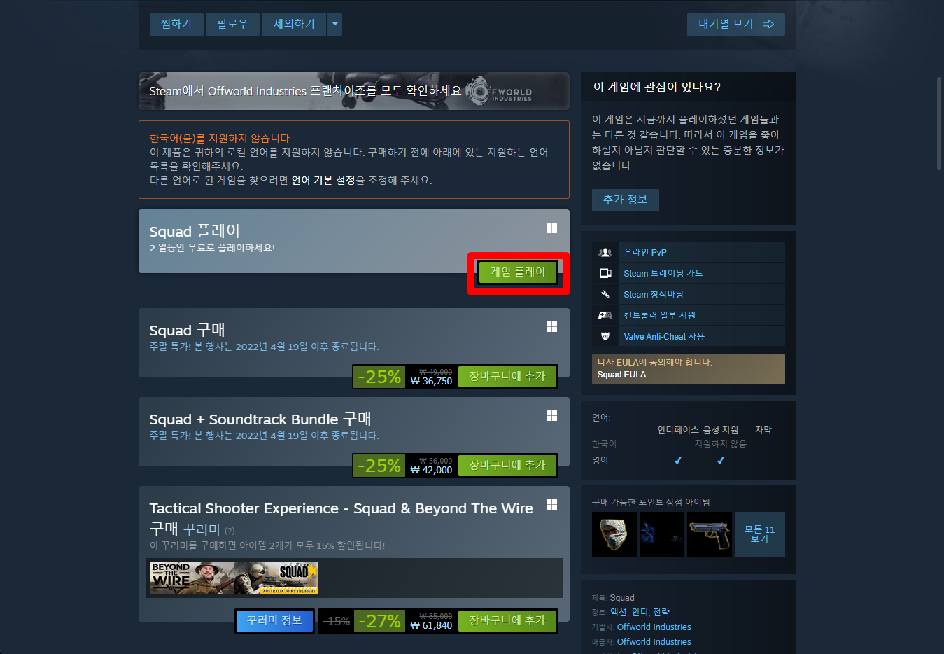 "Squad" 게임페이지를 조금 내려서 [게임 플레이] 버튼을 클릭하면 됩니다.