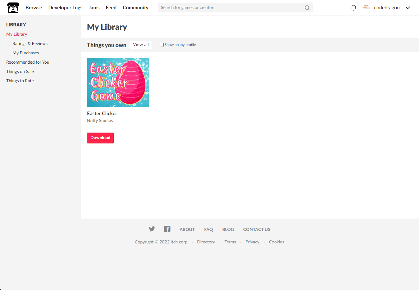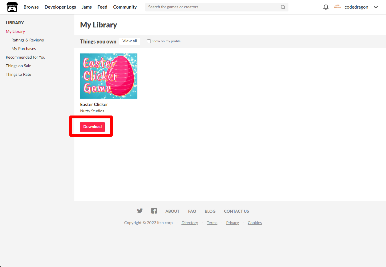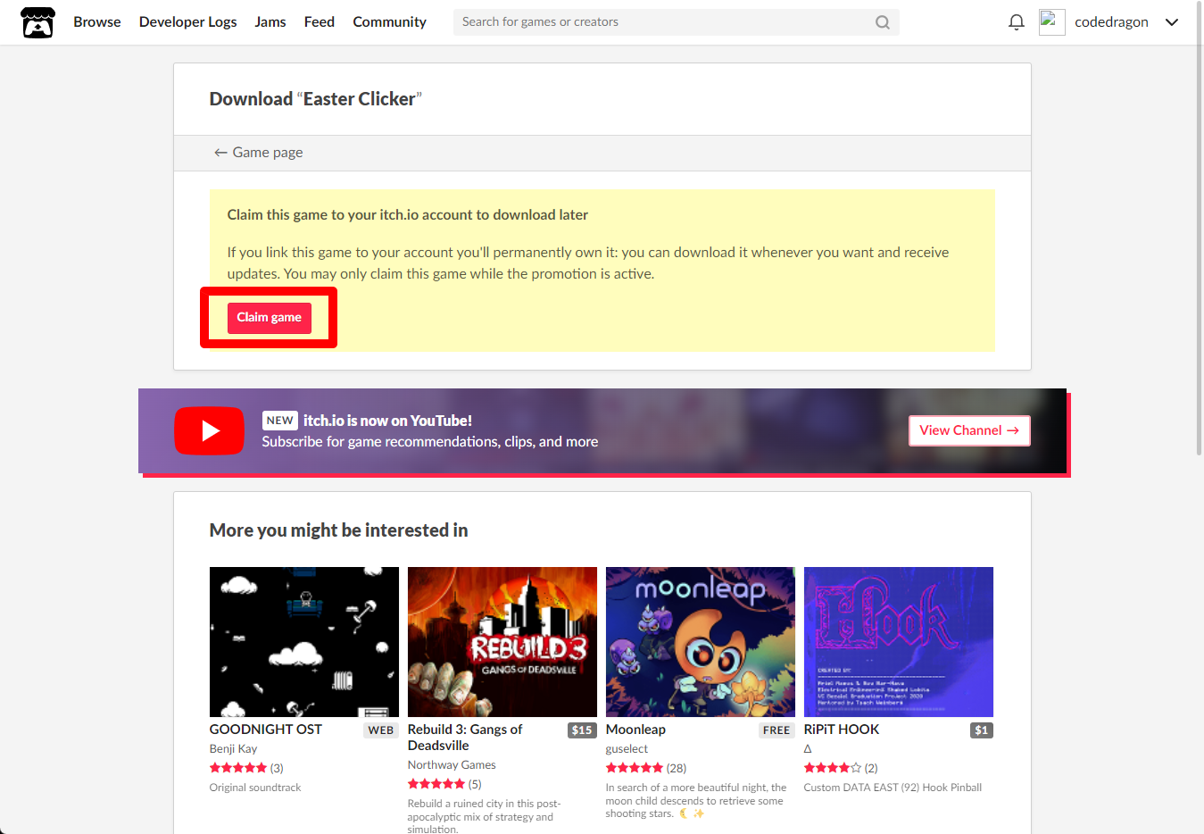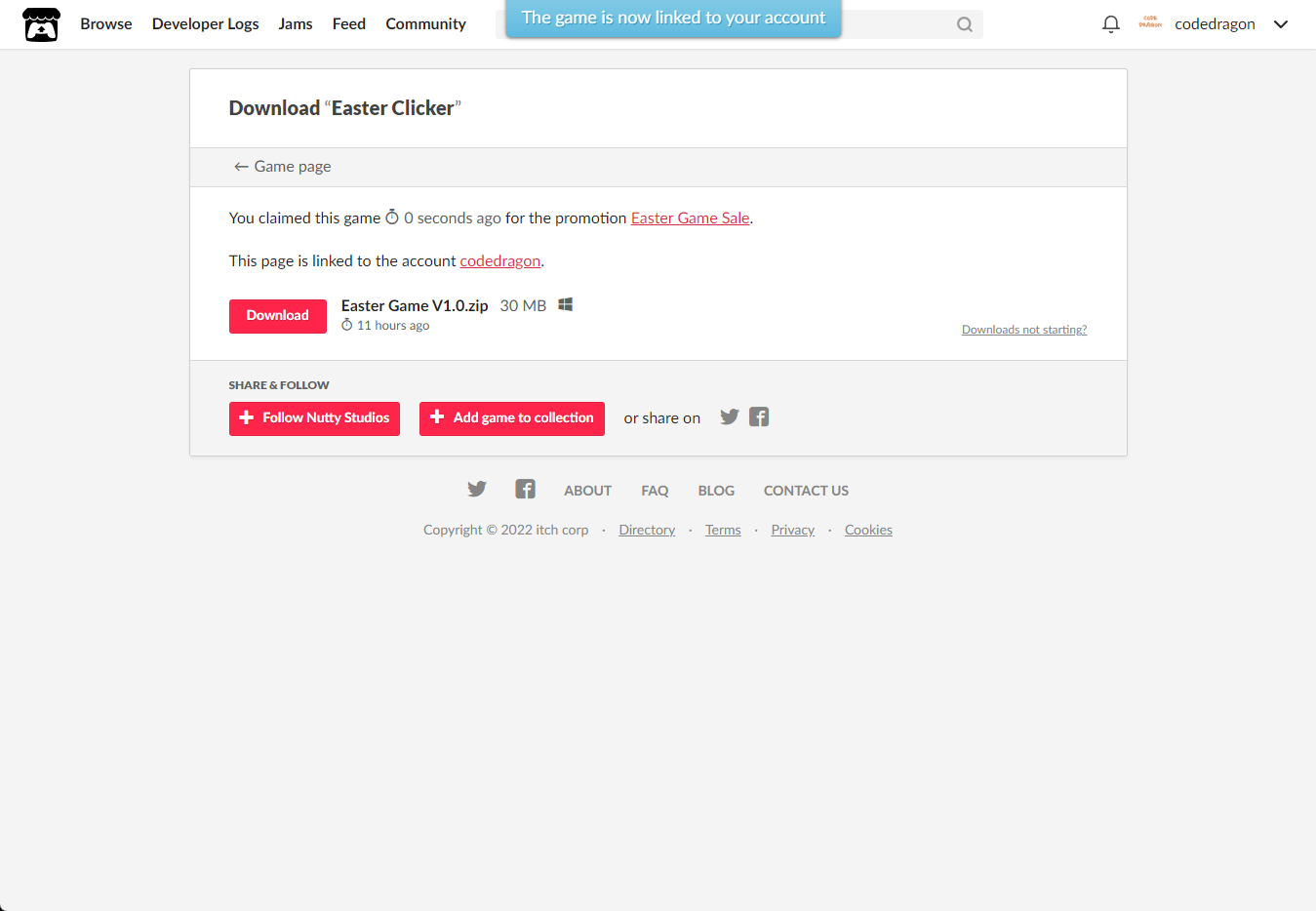 [Claim game]을 클릭하면 "Easter Clicker" 게임이 나의 게임 라이브러리에 추가되고 설치파일을 다운받을 수 있는 페이지로 이동됩니다.