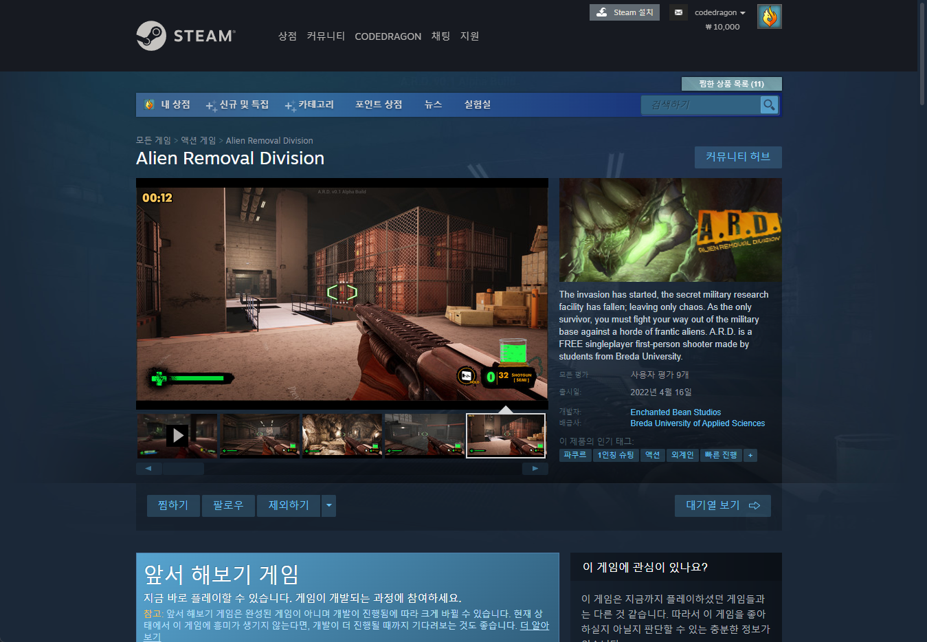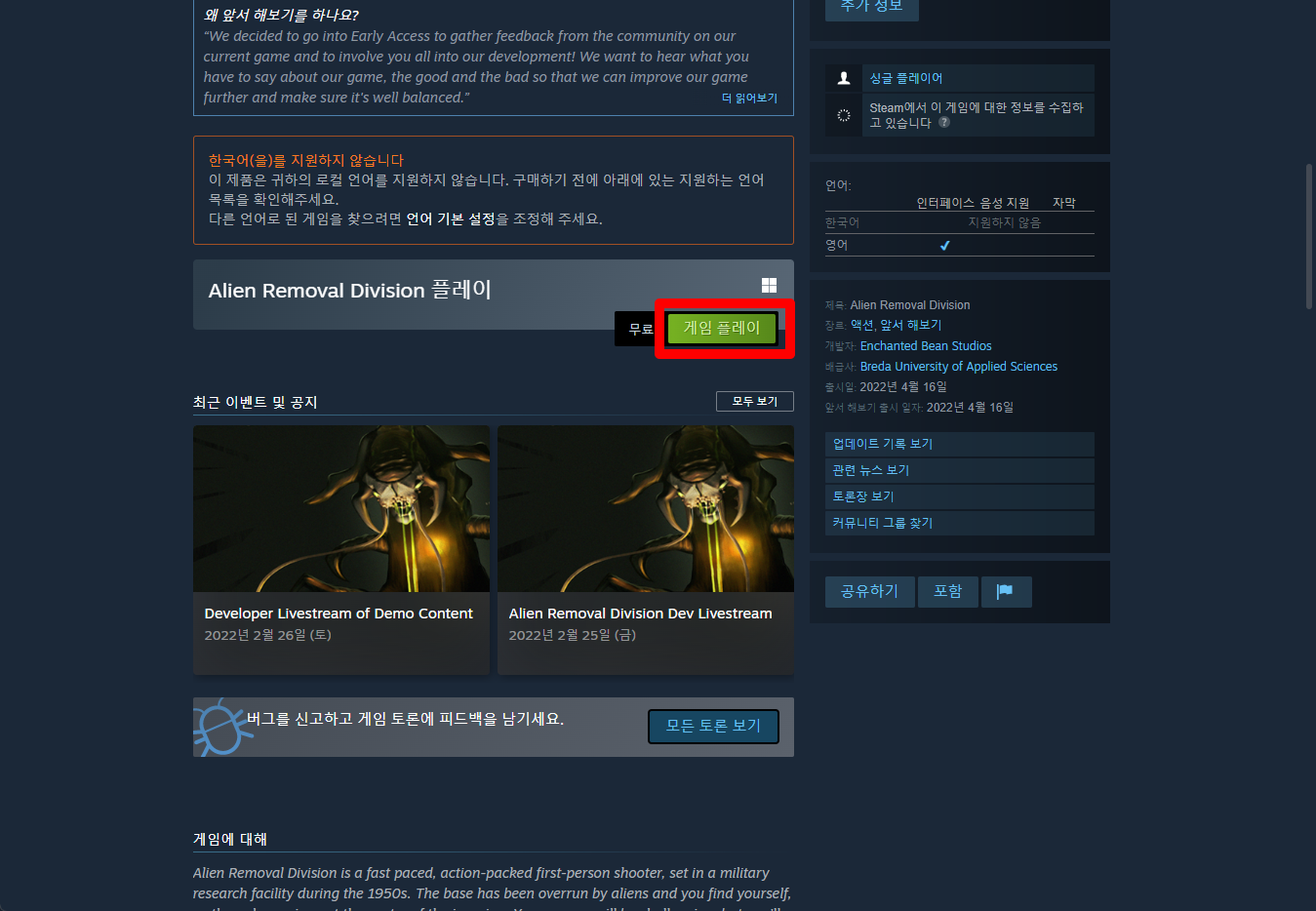 "Alien Removal Division" 페이지를 내려 [게임 플레이]를 클릭하면 됩니다.