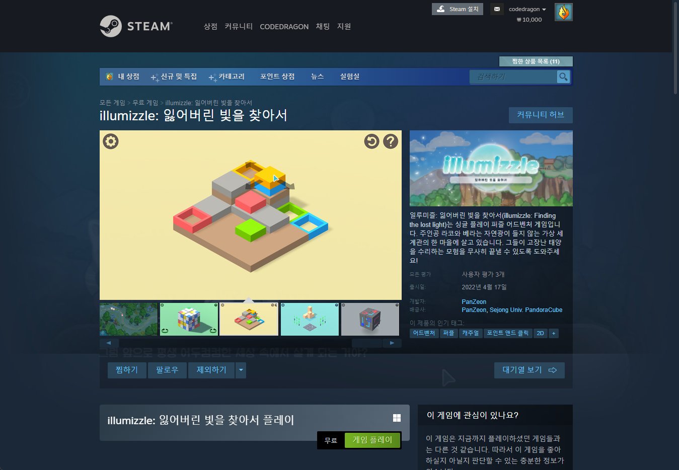 "illumizzle: 잃어버린 빛을 찾아서" 페이지를 내려 [게임 플레이]를 클릭하면 됩니다.
