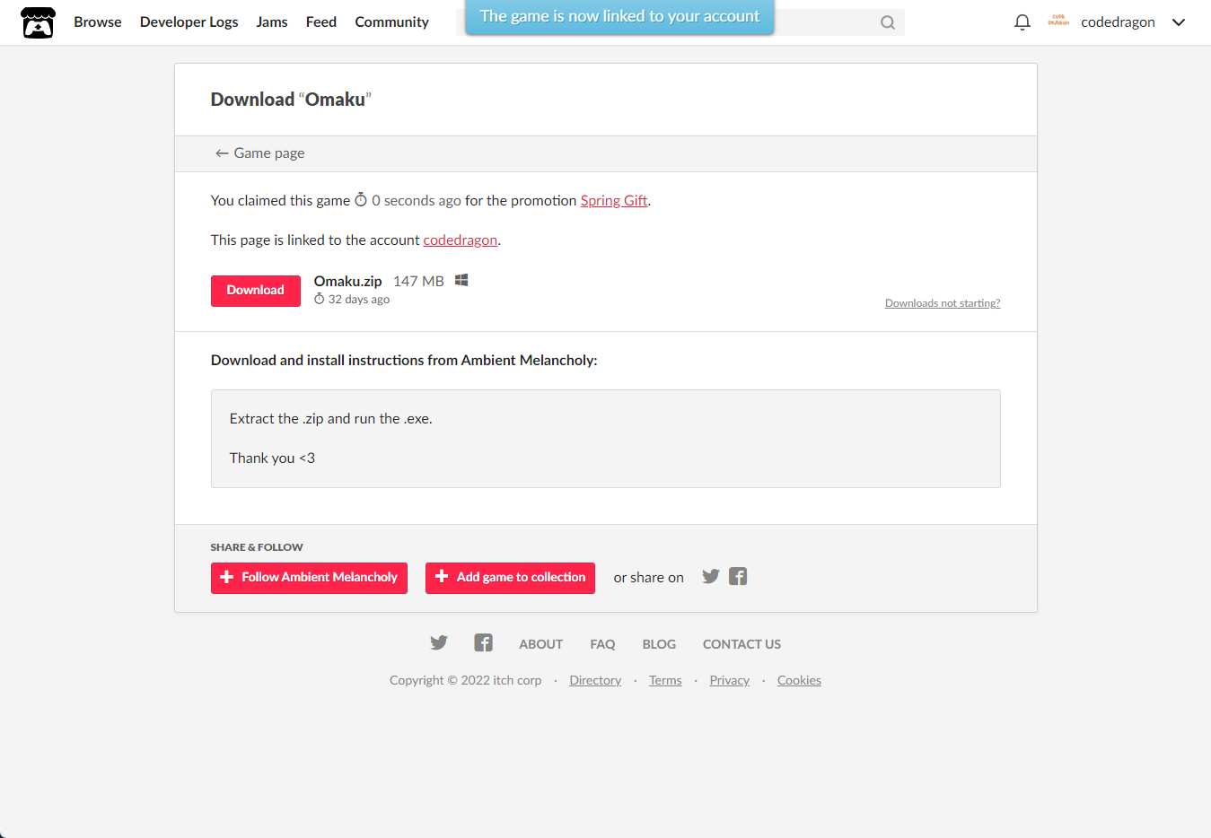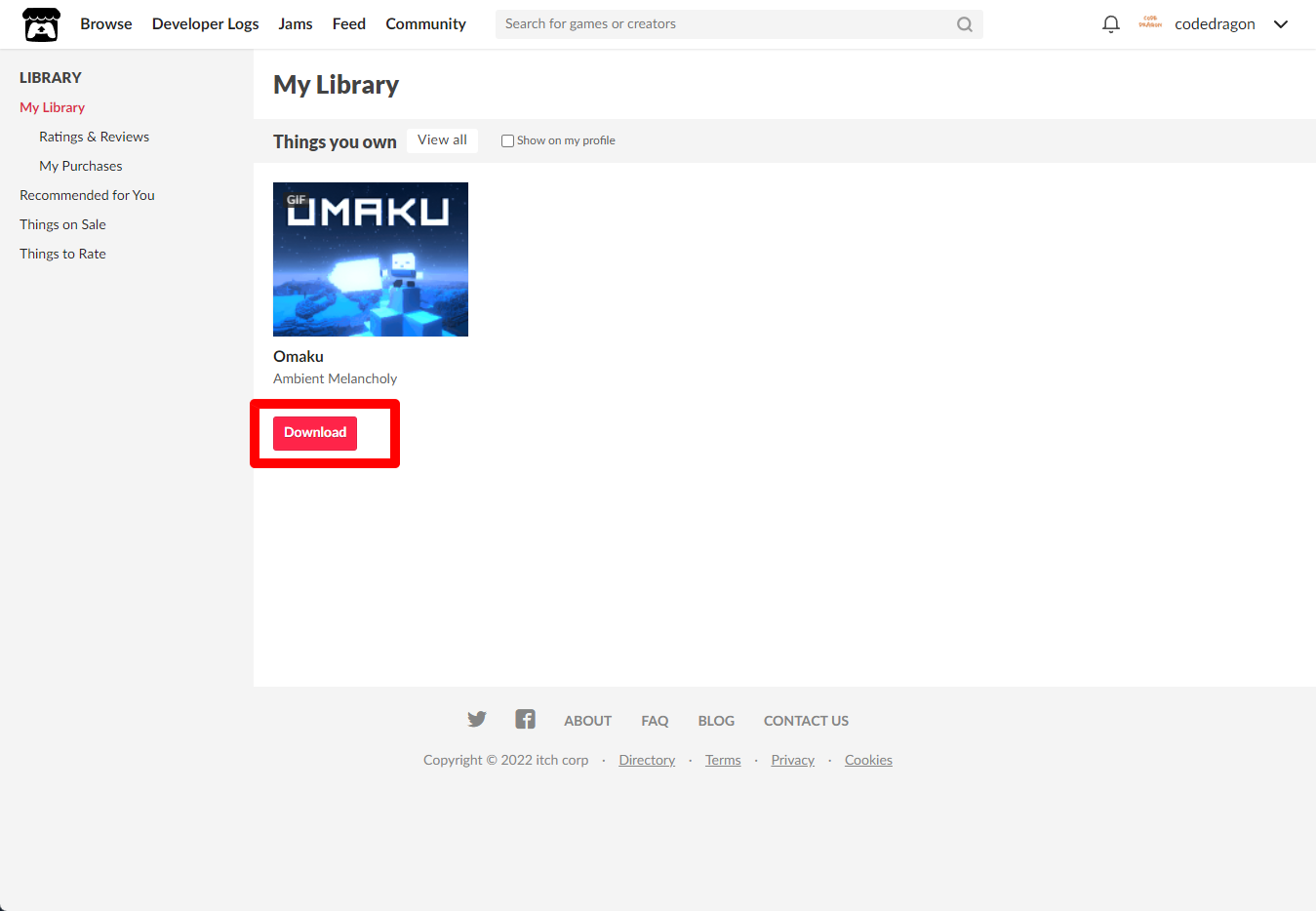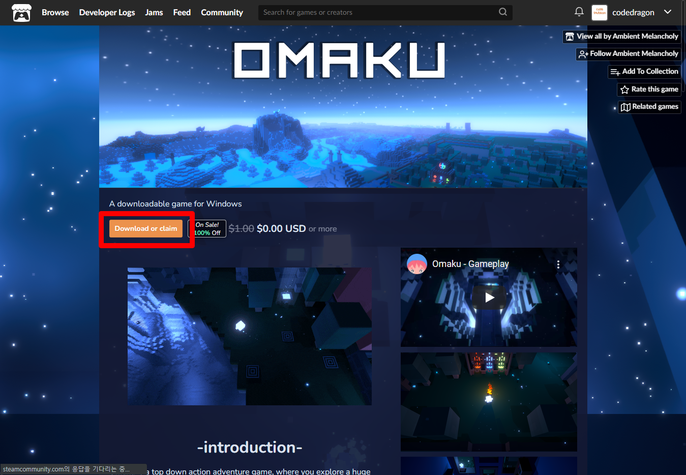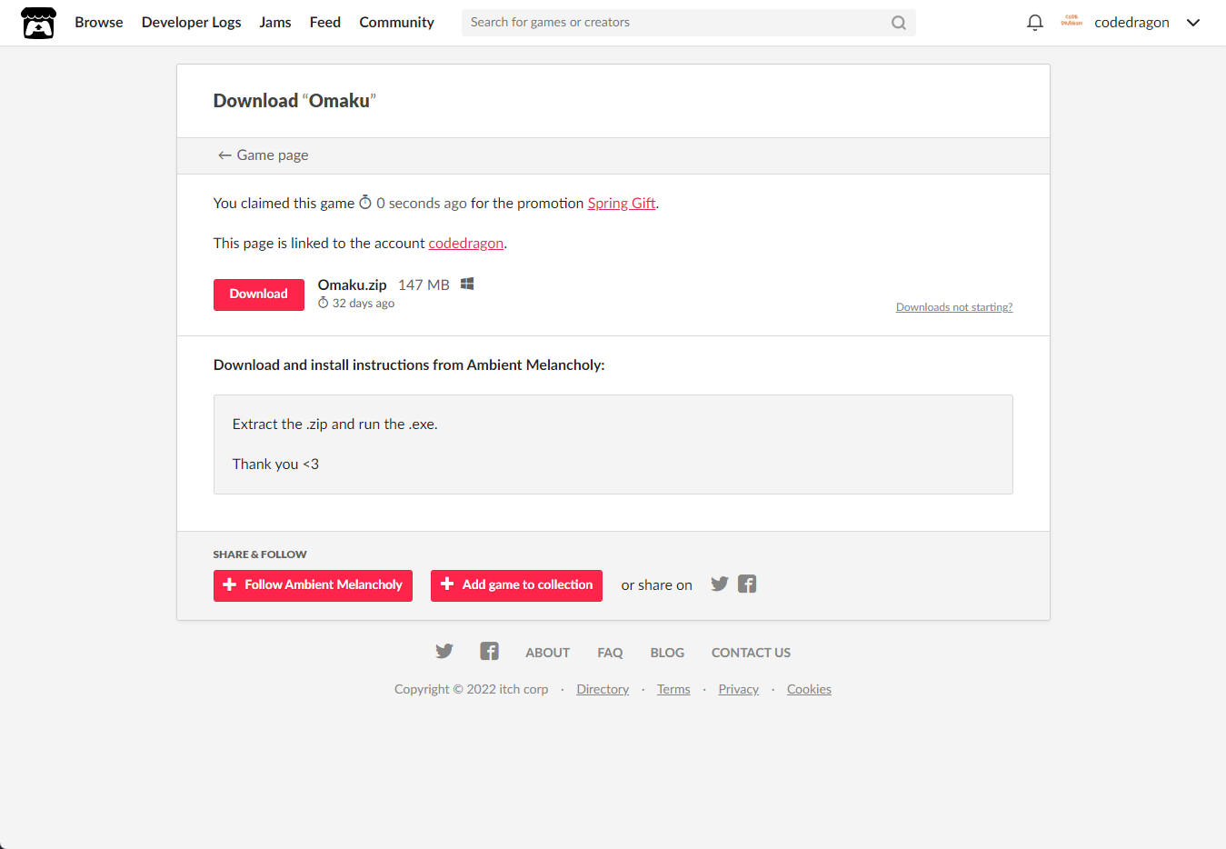 [Claim game]을 클릭하면 "Omaku" 게임이 나의 게임 라이브러리에 추가되고 설치파일을 다운받을 수 있는 페이지로 이동됩니다.