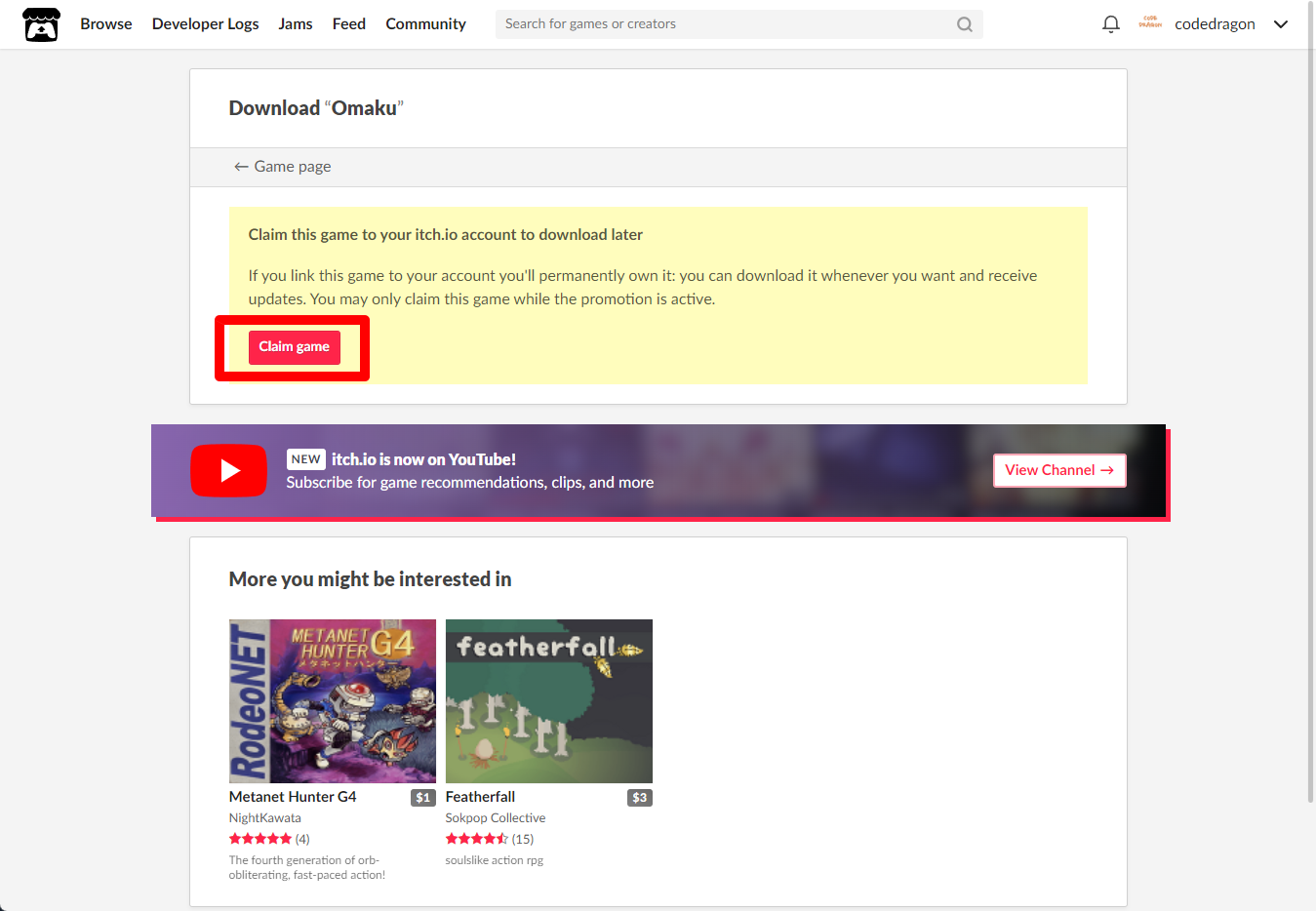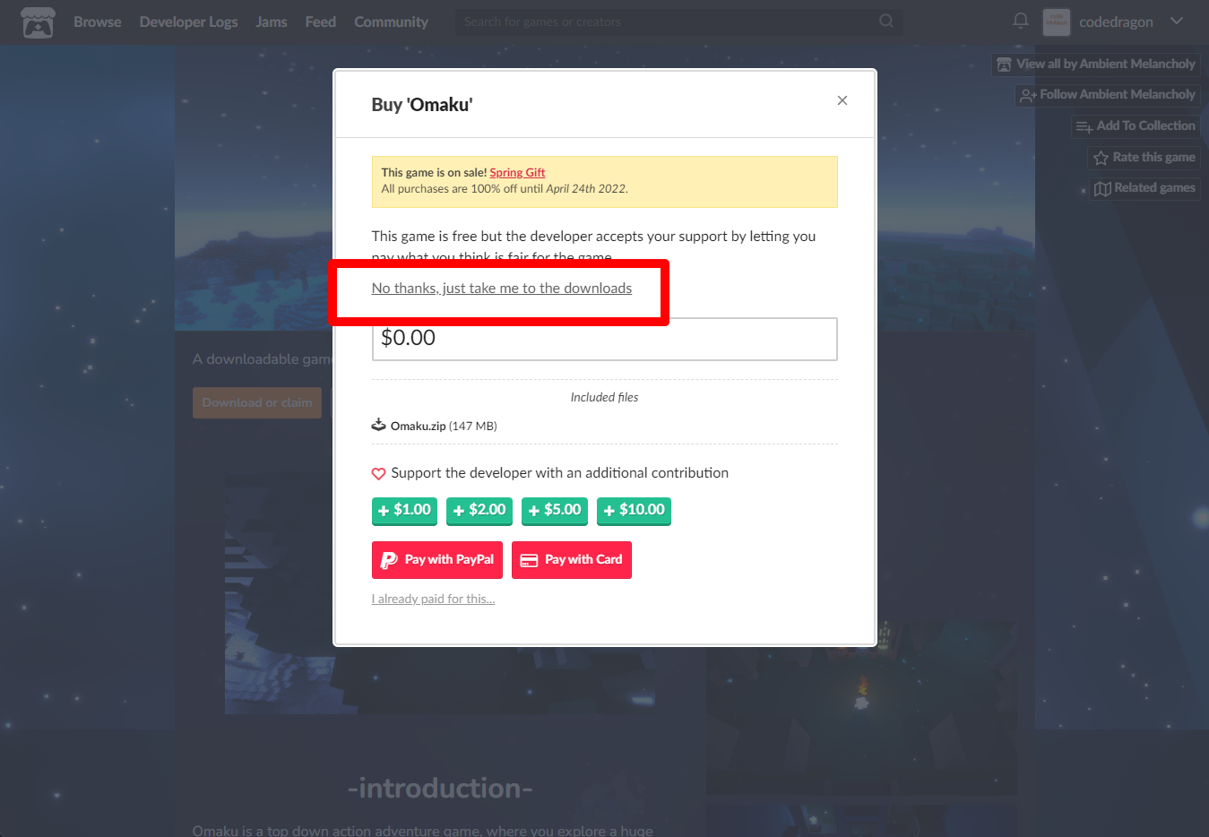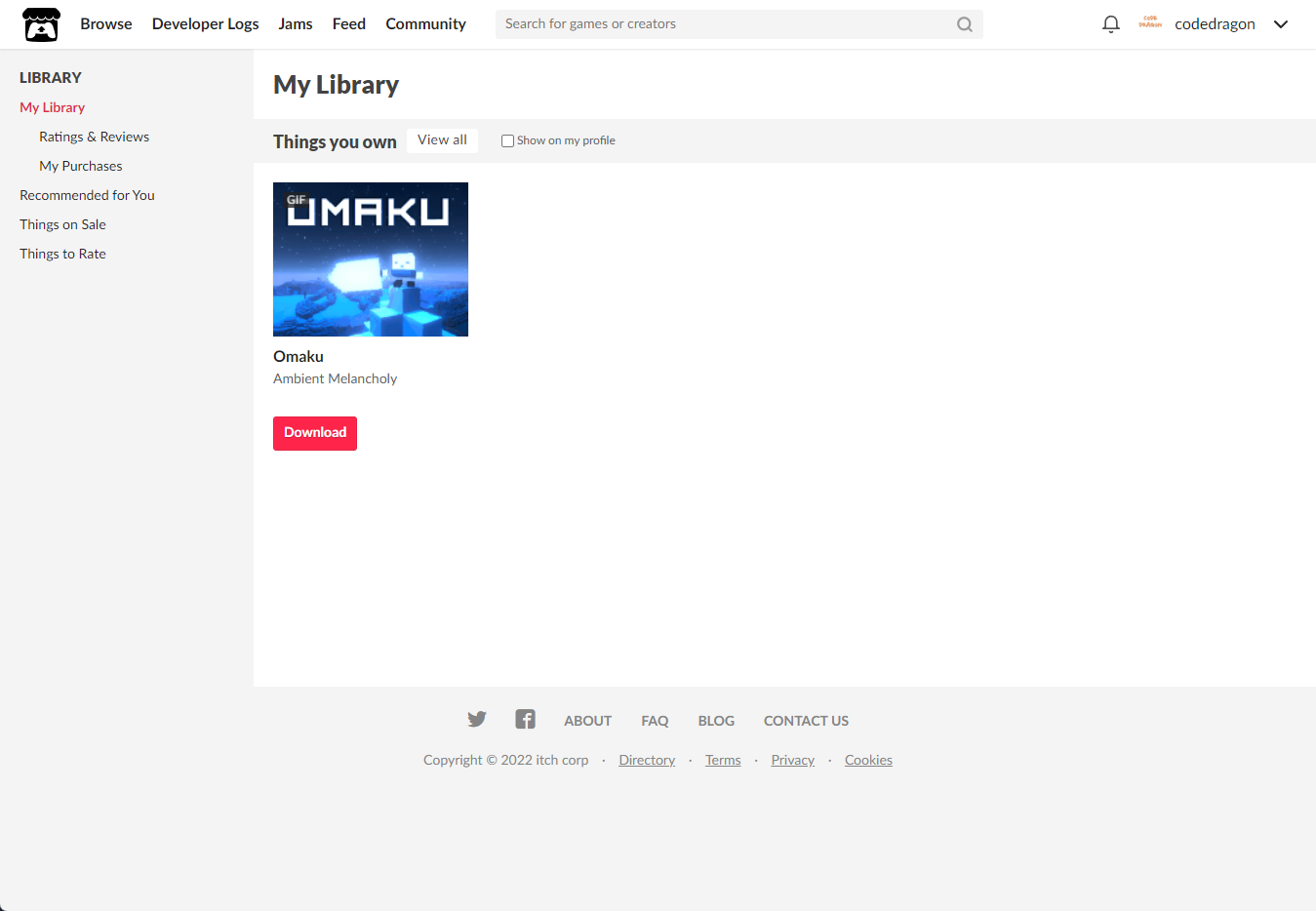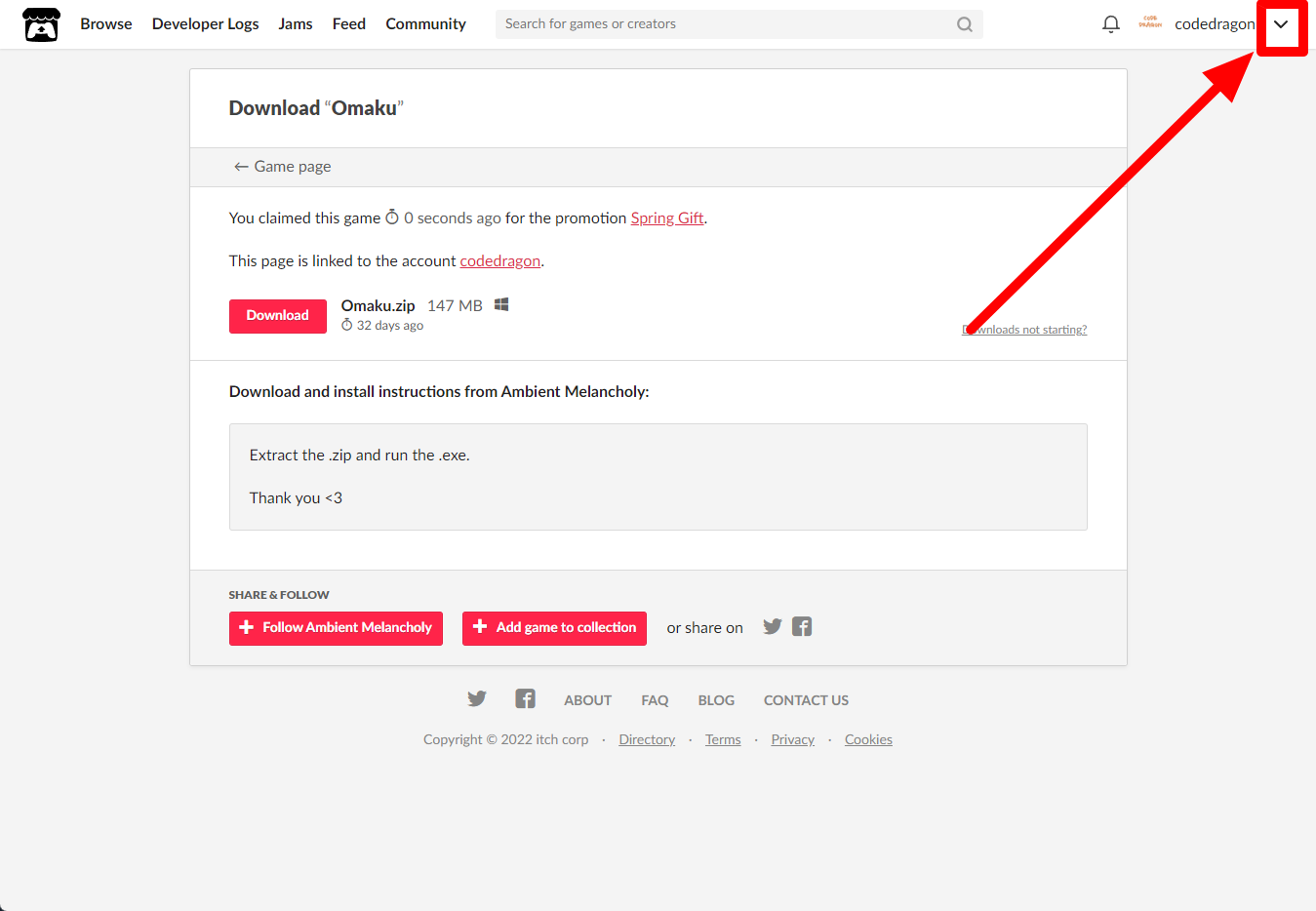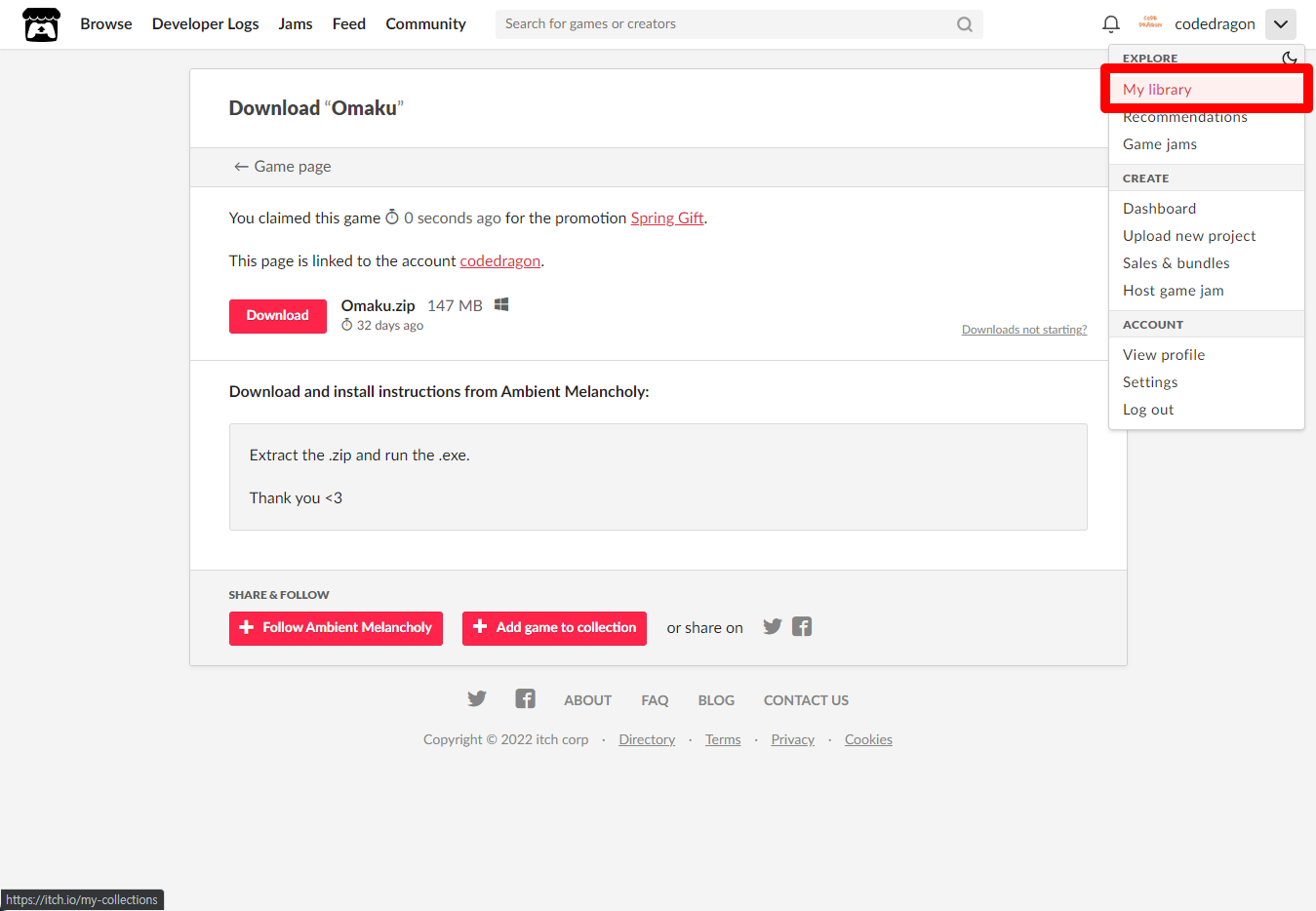 [Claim game]을 클릭하면 "Omaku" 게임이 나의 게임 라이브러리에 추가되고 설치파일을 다운받을 수 있는 페이지로 이동됩니다.