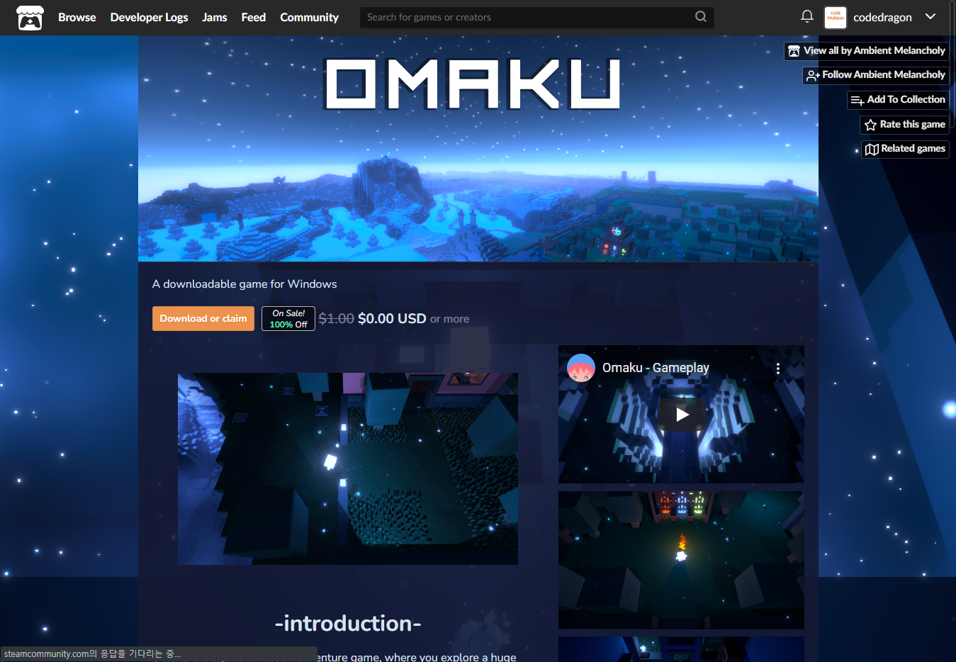 ₩1,399 -> ₩0(Free) Omaku 오마쿠 무료로 받기 영구소장 - itch.io 잇치 닷 아이오 한시적 무료 소장하기