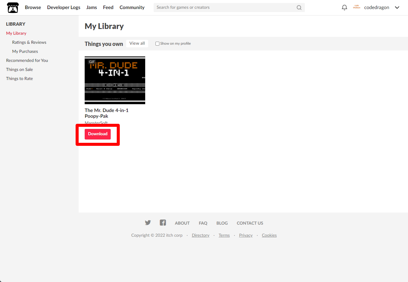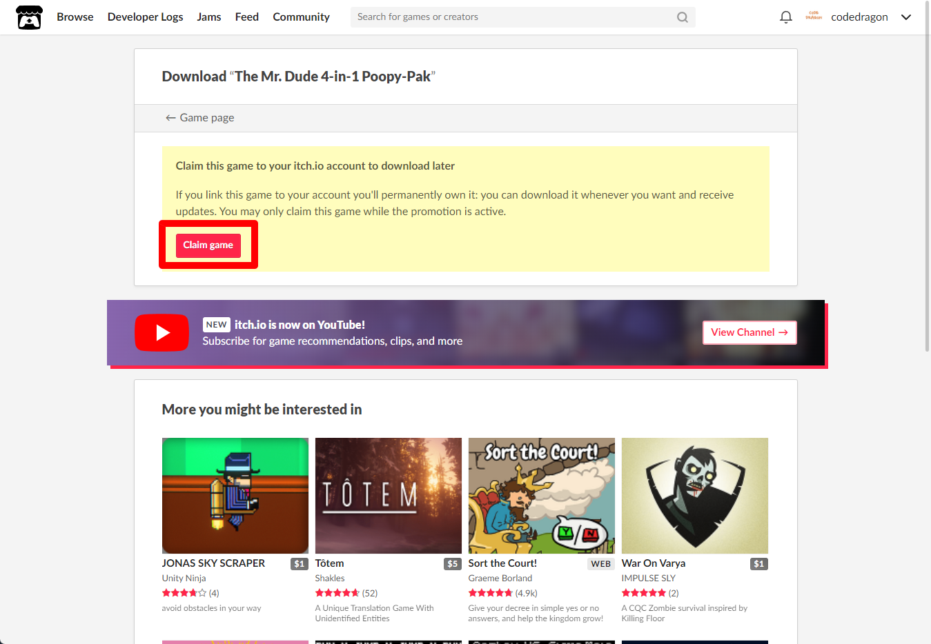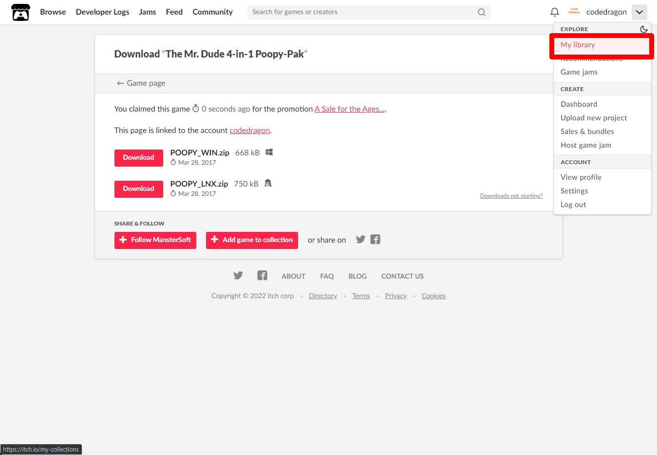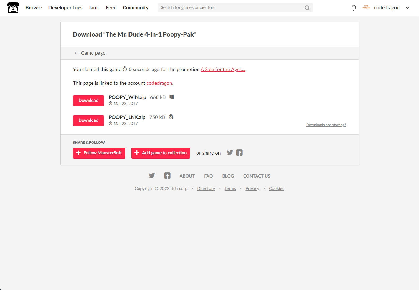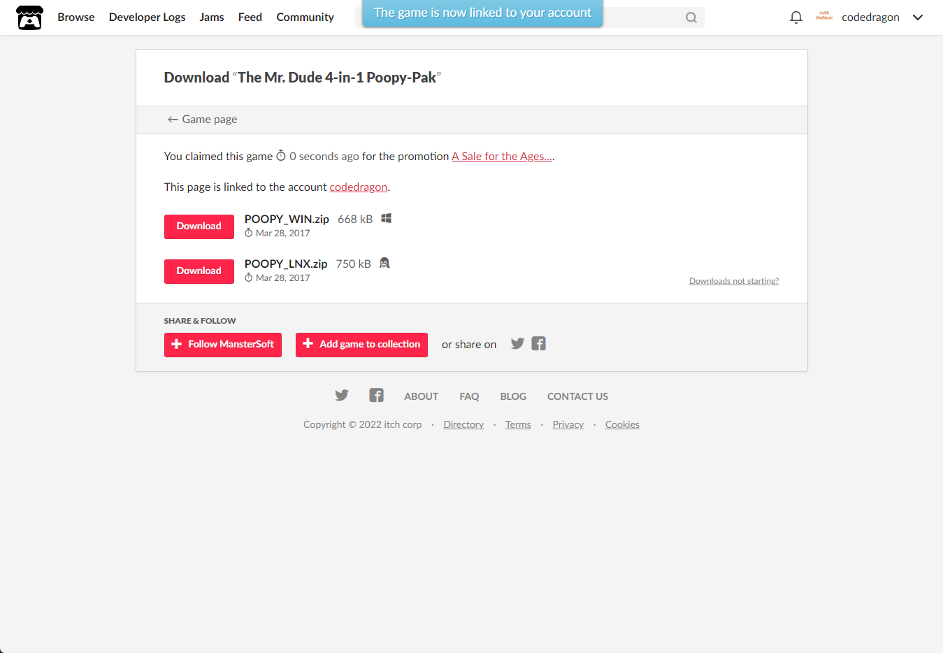[Claim game]을 클릭하면 "The Mr. Dude 4-in-1 Poopy-Pak" 게임이 나의 게임 라이브러리에 추가되고 설치파일을 다운받을 수 있는 페이지로 이동됩니다.