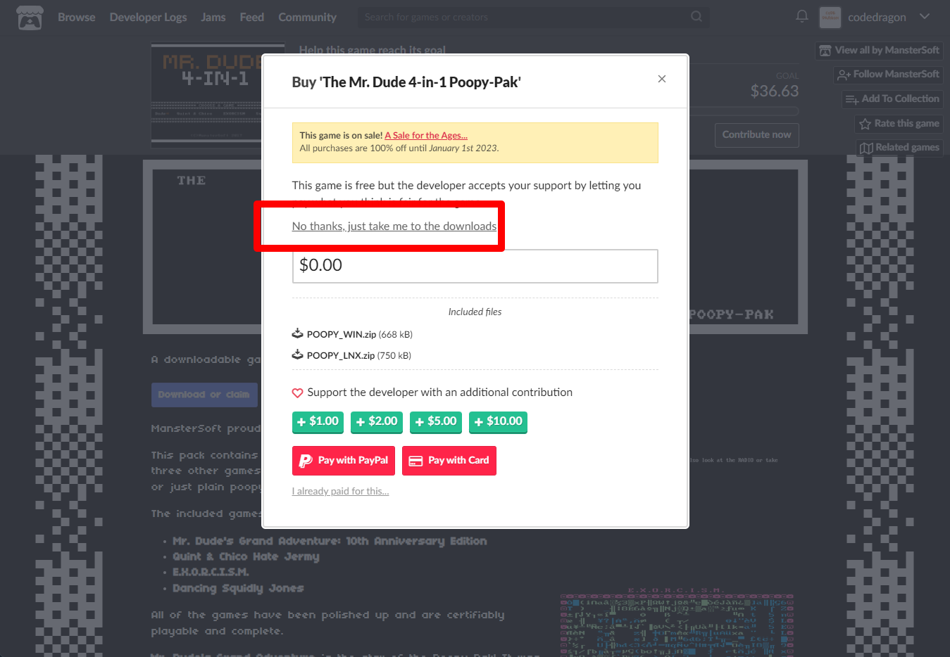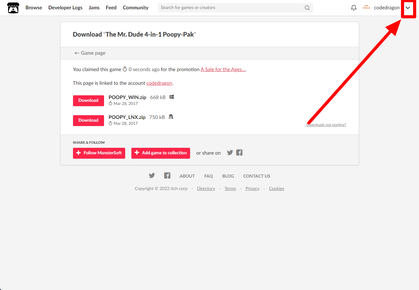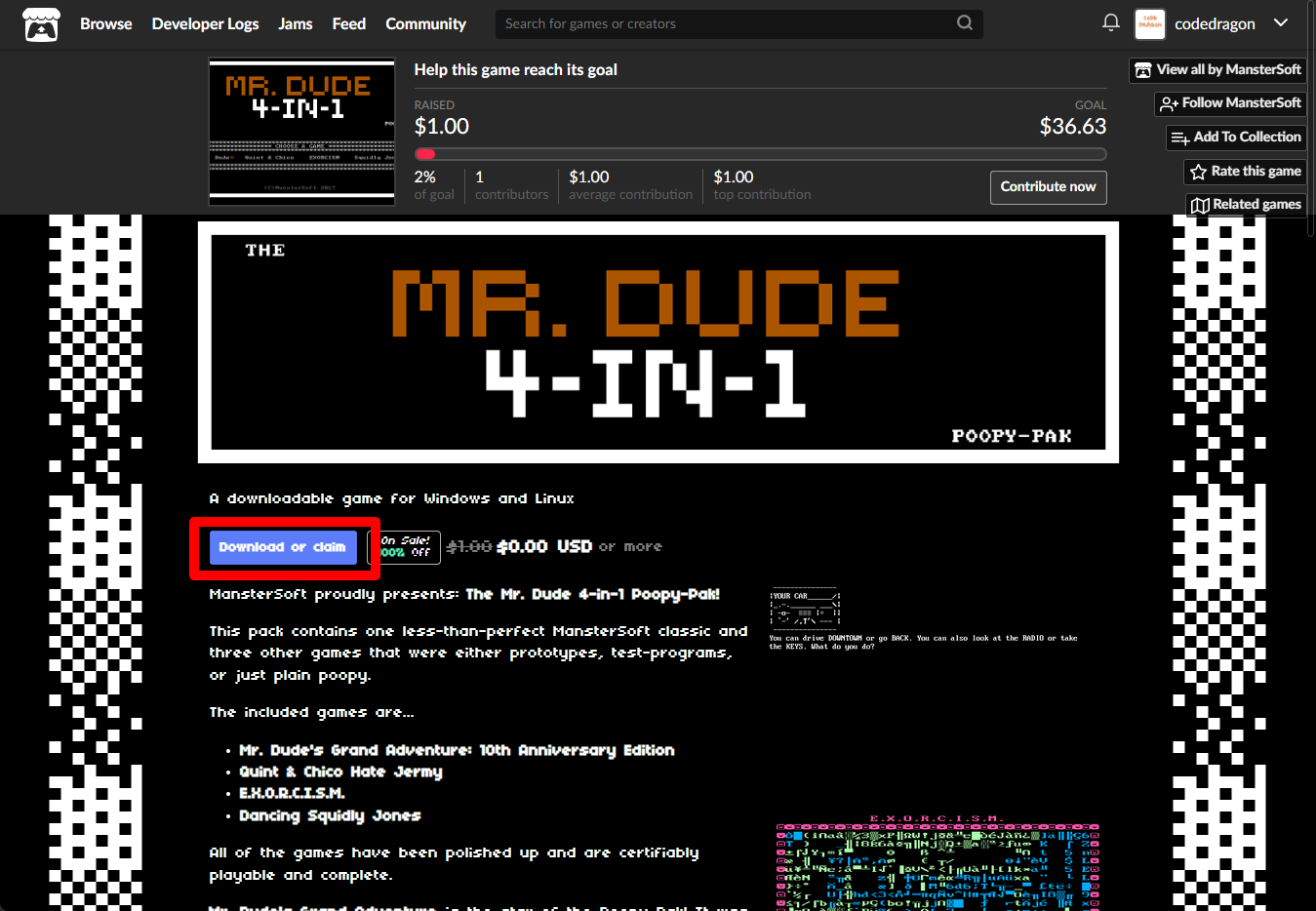 [Claim game]을 클릭하면 "The Mr. Dude 4-in-1 Poopy-Pak" 게임이 나의 게임 라이브러리에 추가되고 설치파일을 다운받을 수 있는 페이지로 이동됩니다.
