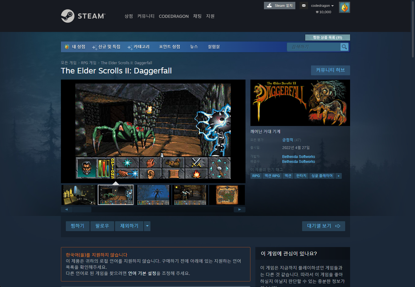 "The Elder Scrolls II: Daggerfall" 스팀 페이지 입니다.