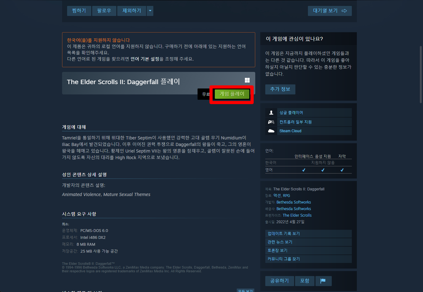 "The Elder Scrolls II: Daggerfall" 페이지를 내려 [게임 플레이]를 클릭하면 됩니다.