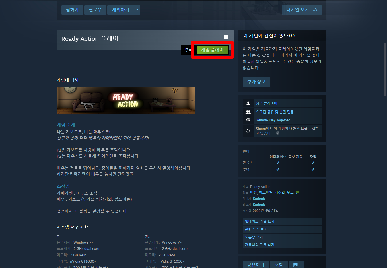 "Ready Action" 페이지를 내려 [게임 플레이]를 클릭하면 됩니다.