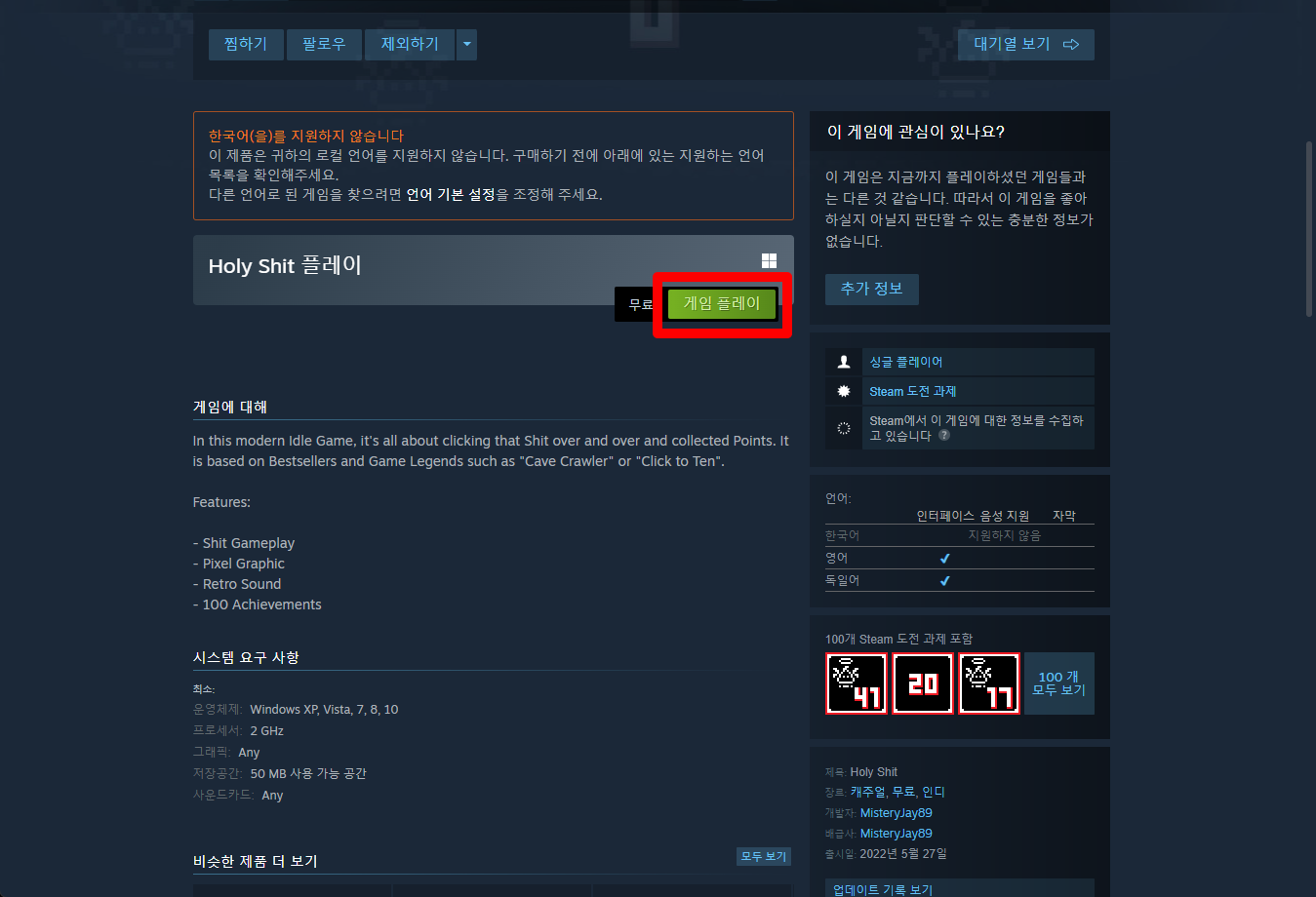 "Holy Shit" 페이지를 내려 [게임 플레이]를 클릭하면 됩니다.
