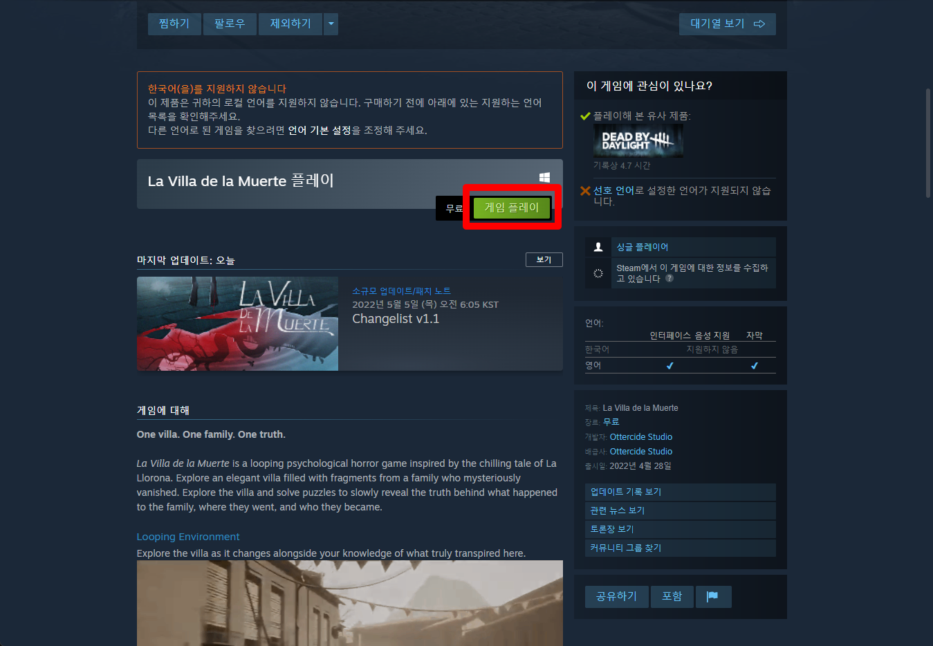 "La Villa de la Muerte" 페이지를 내려 [게임 플레이]를 클릭하면 됩니다.