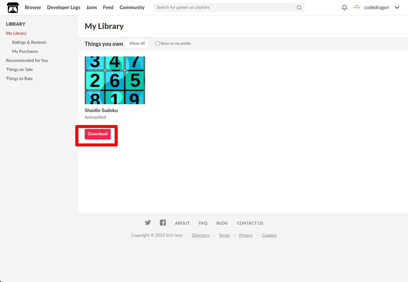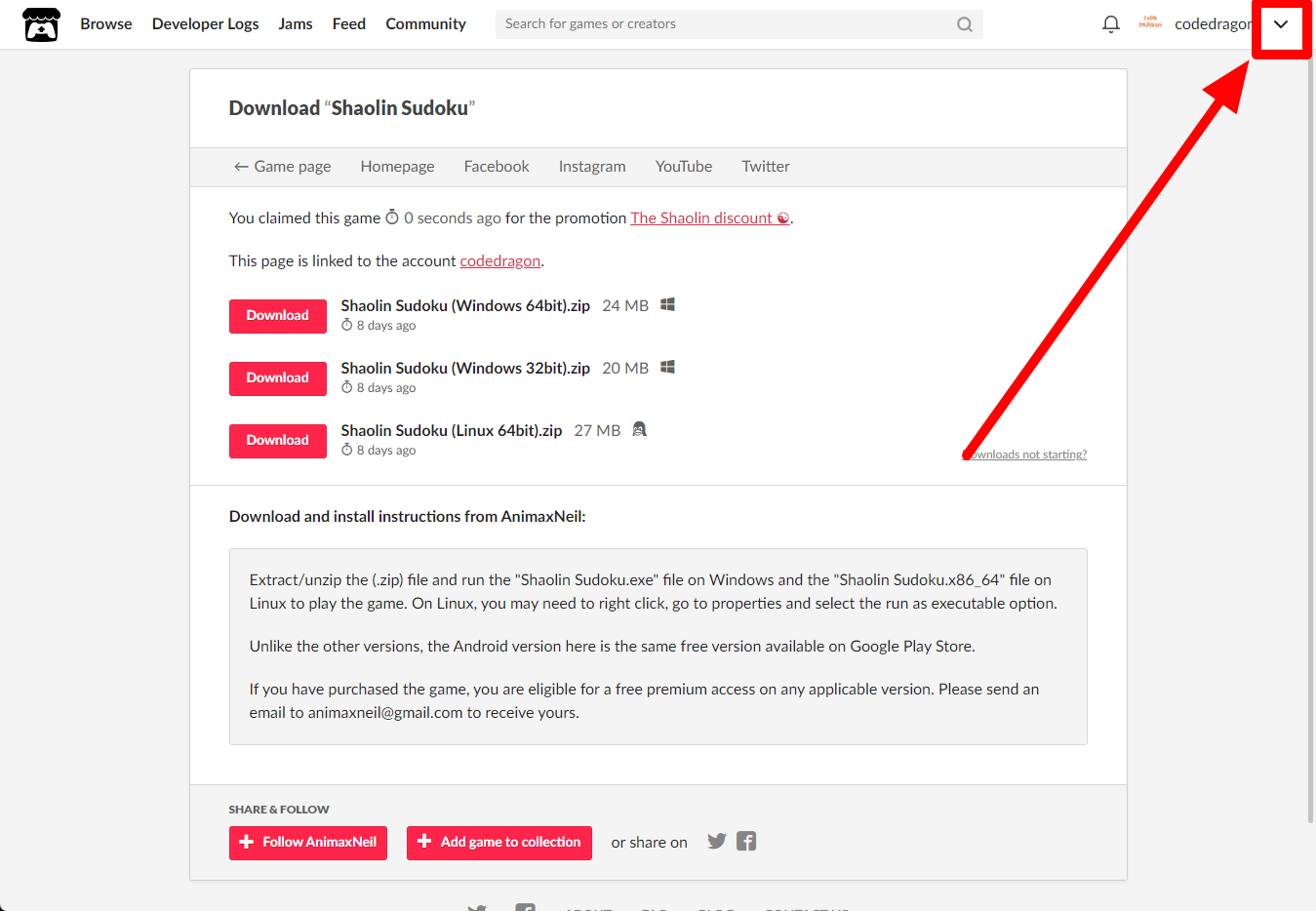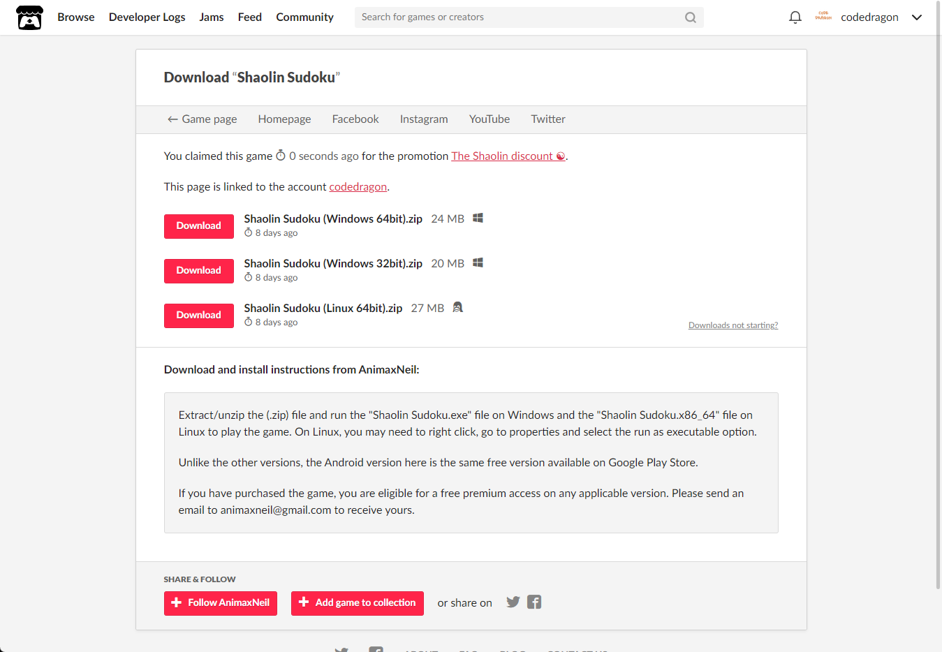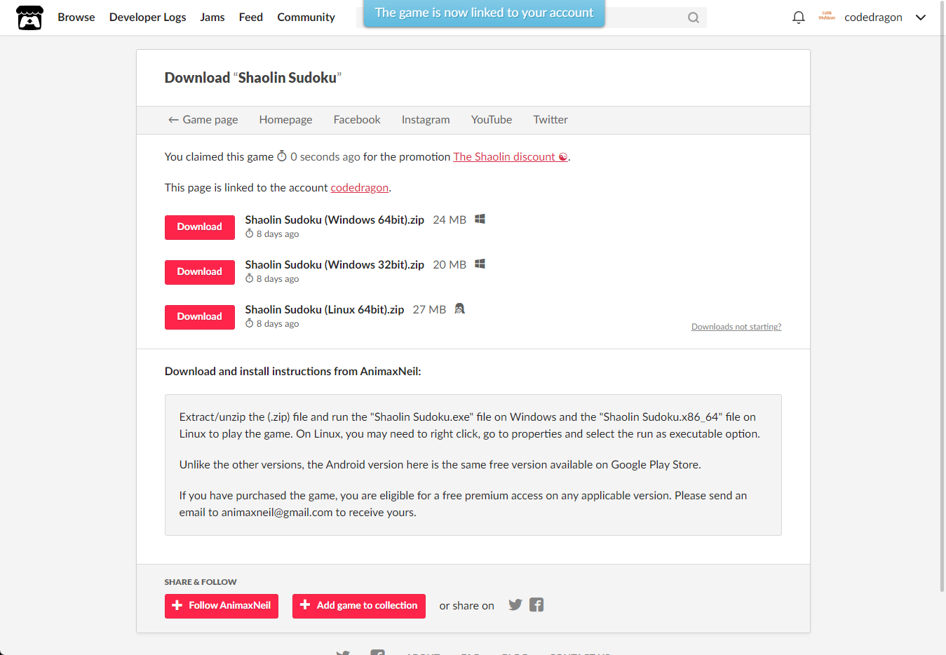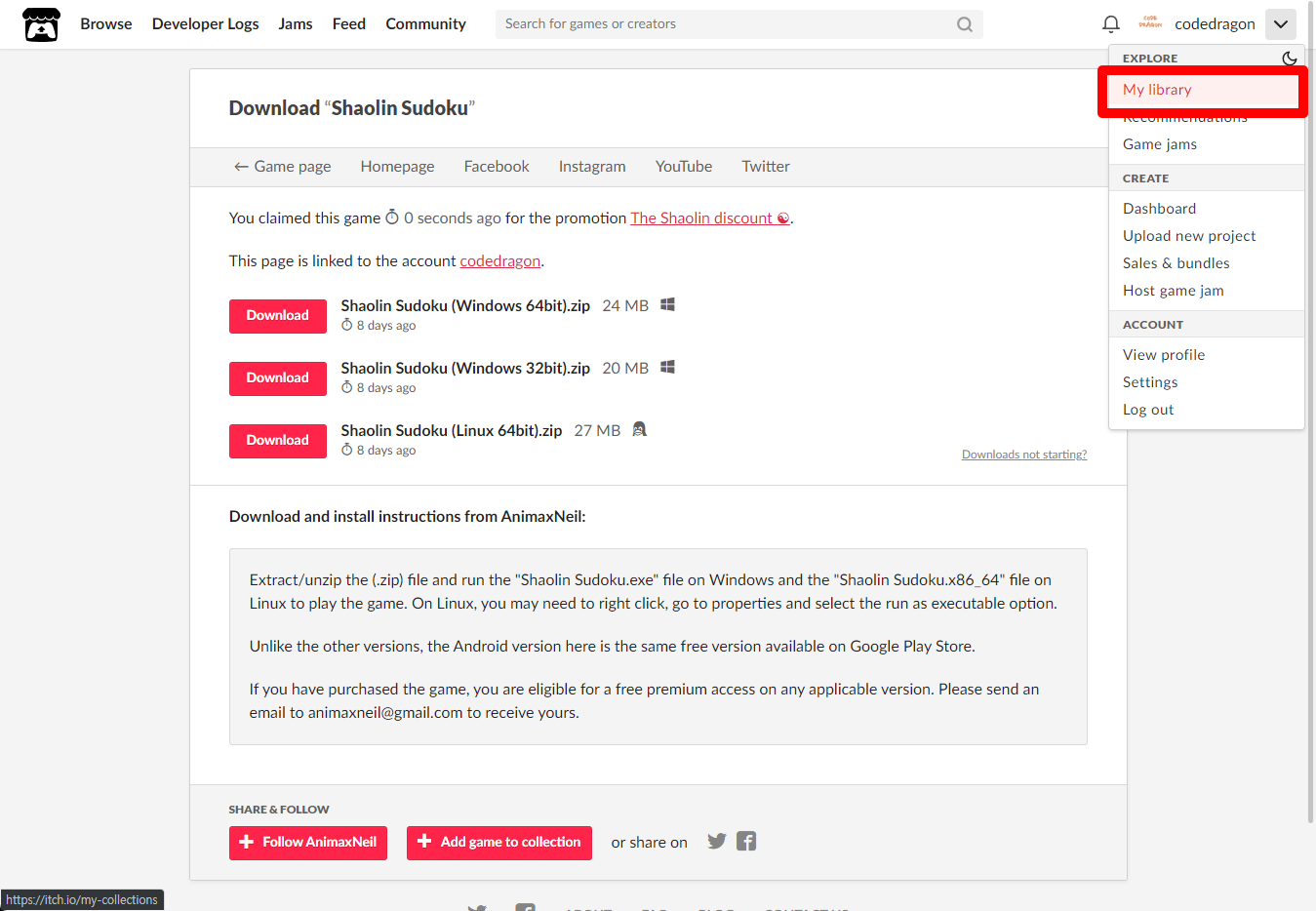 [Claim game]을 클릭하면 "Shaolin Sudoku" 게임이 나의 게임 라이브러리에 추가되고 설치파일을 다운받을 수 있는 페이지로 이동됩니다.