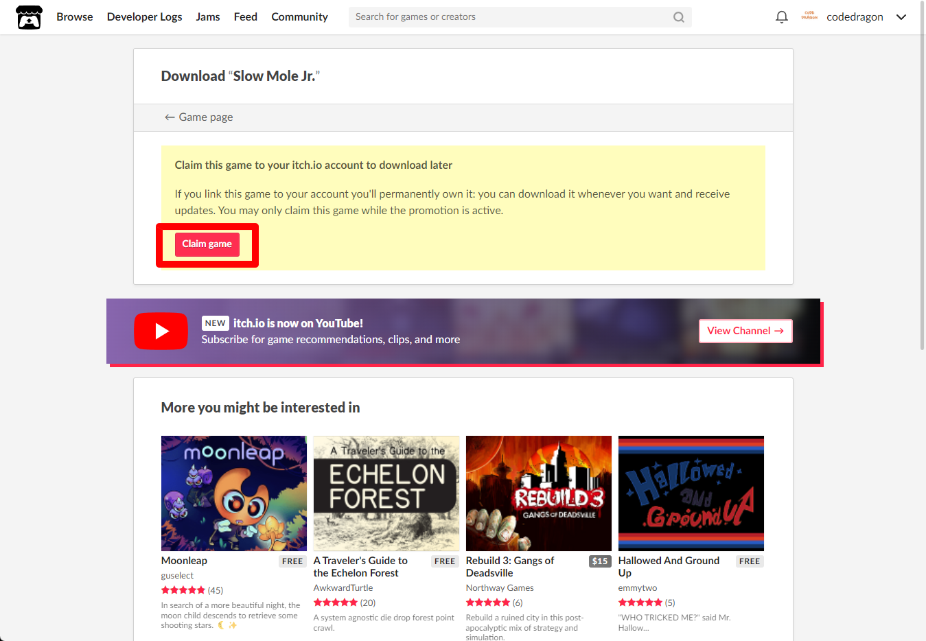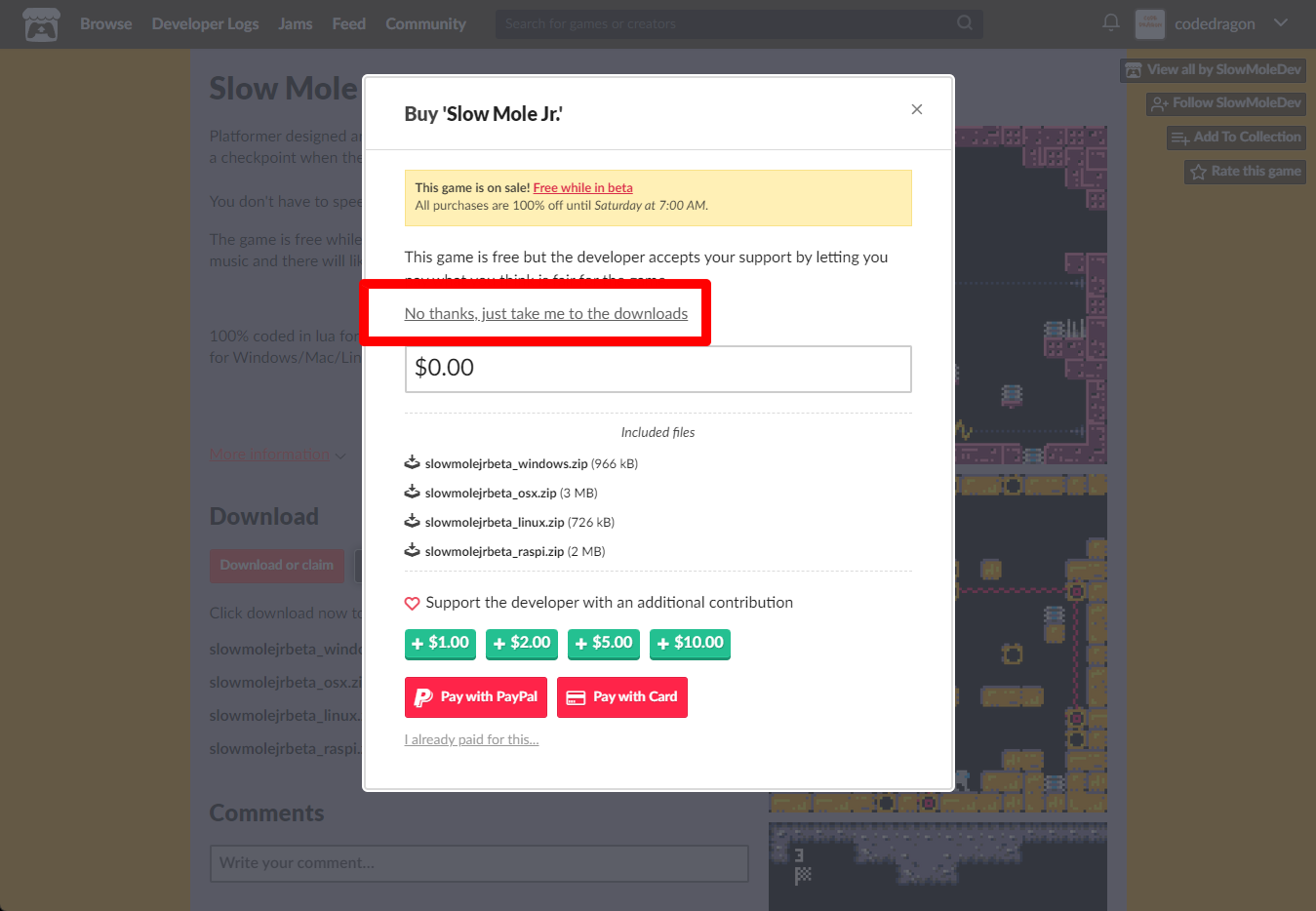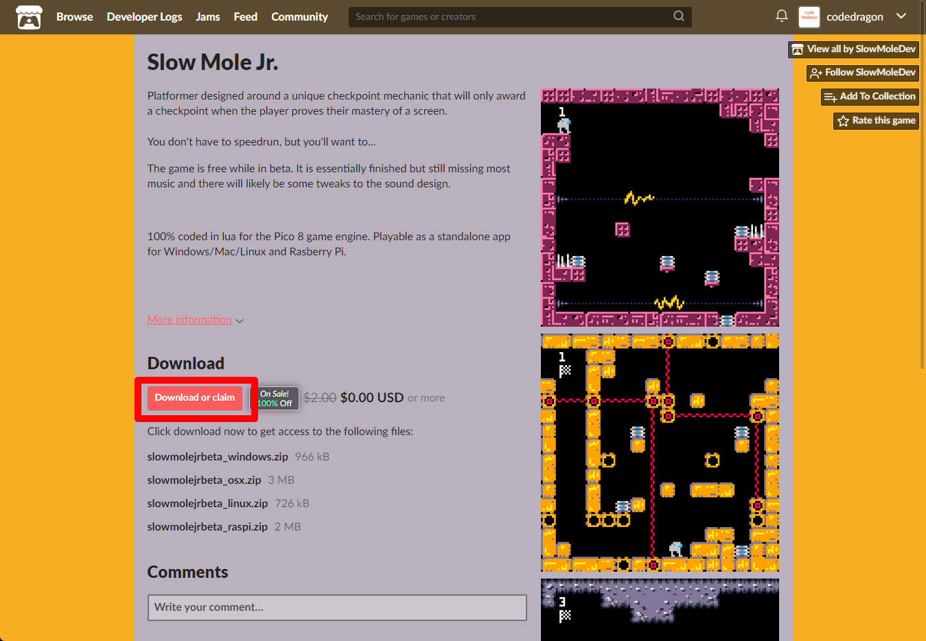 "Slow Mole Jr." 페이지에 있는 [Download or claim]을 클릭합니다.