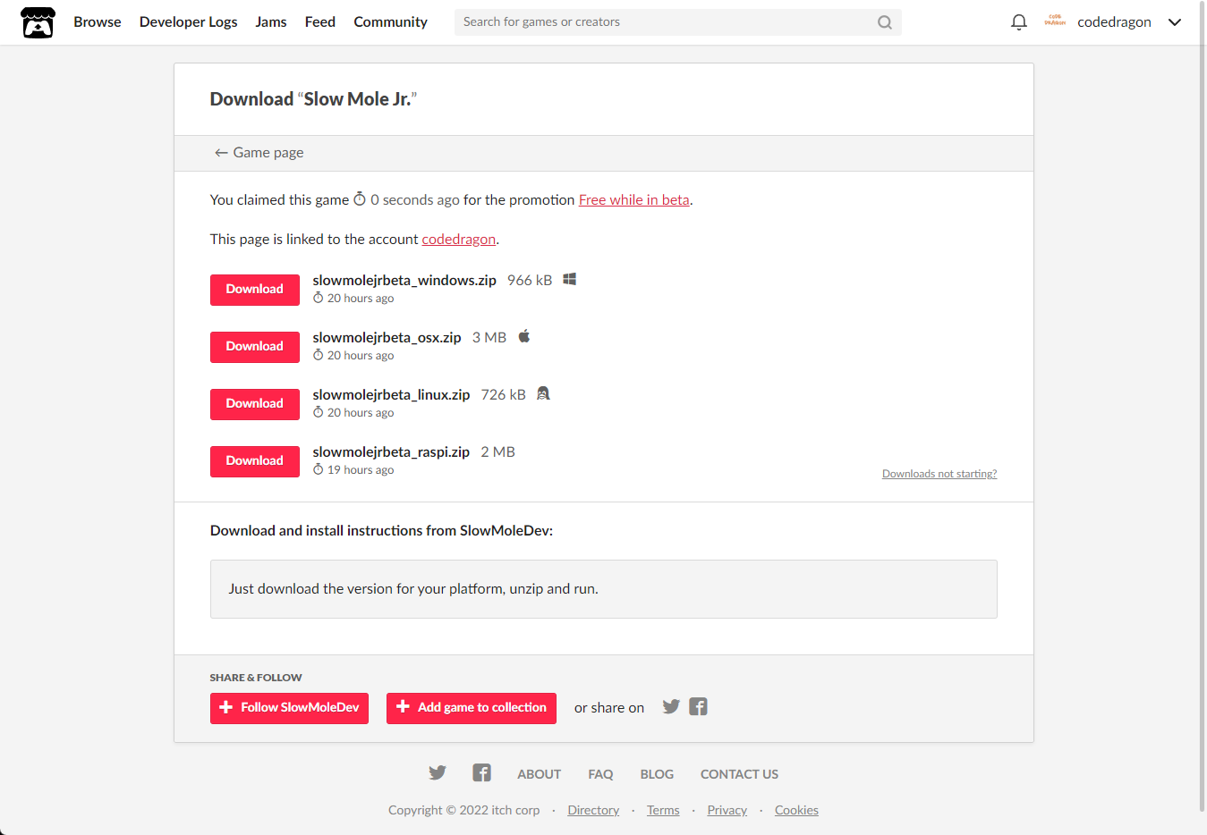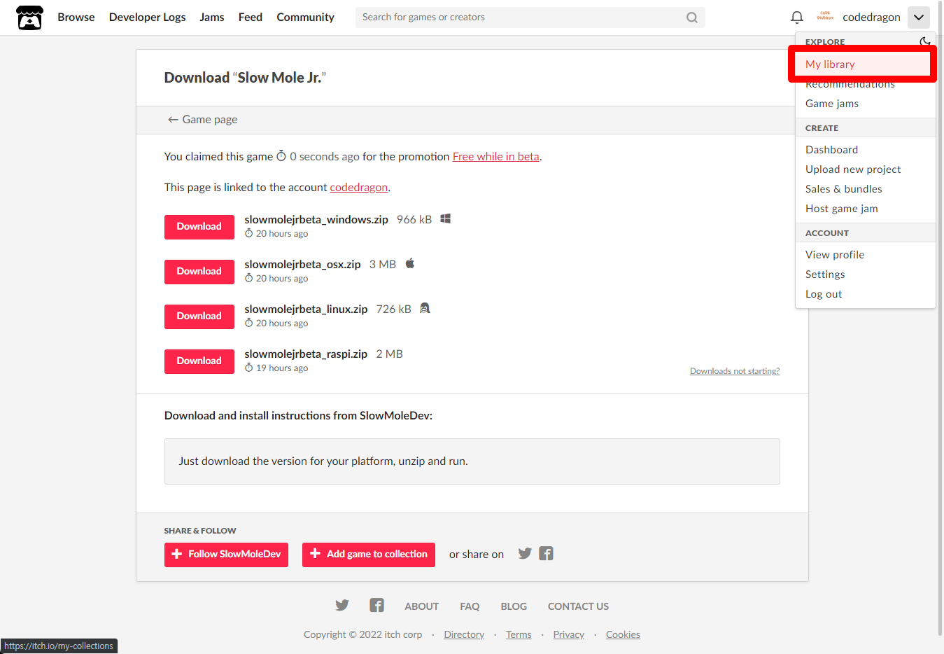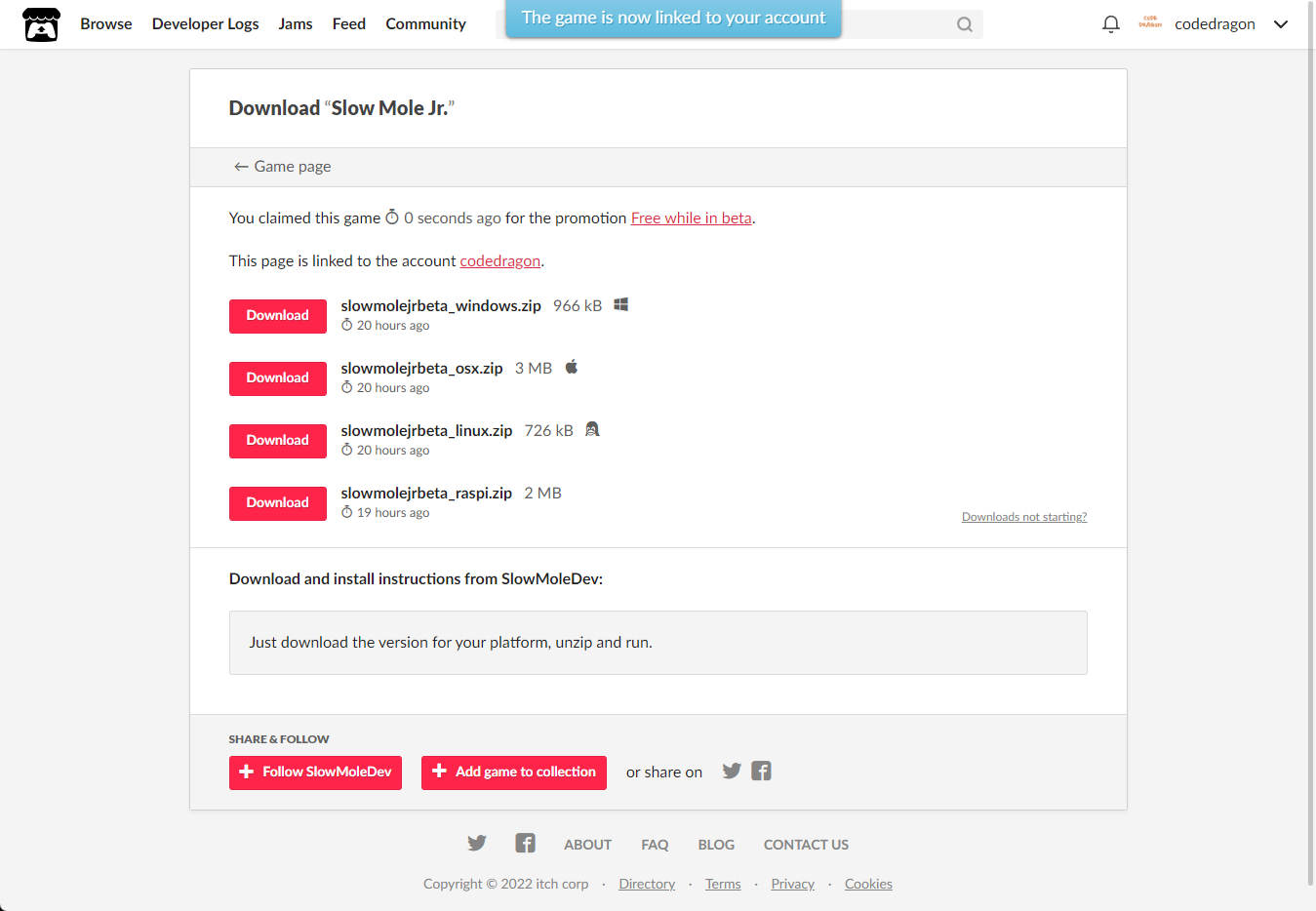 [Claim game]을 클릭하면 "Slow Mole Jr." 게임이 나의 게임 라이브러리에 추가되고 설치파일을 다운받을 수 있는 페이지로 이동됩니다.