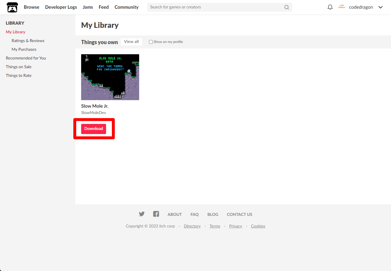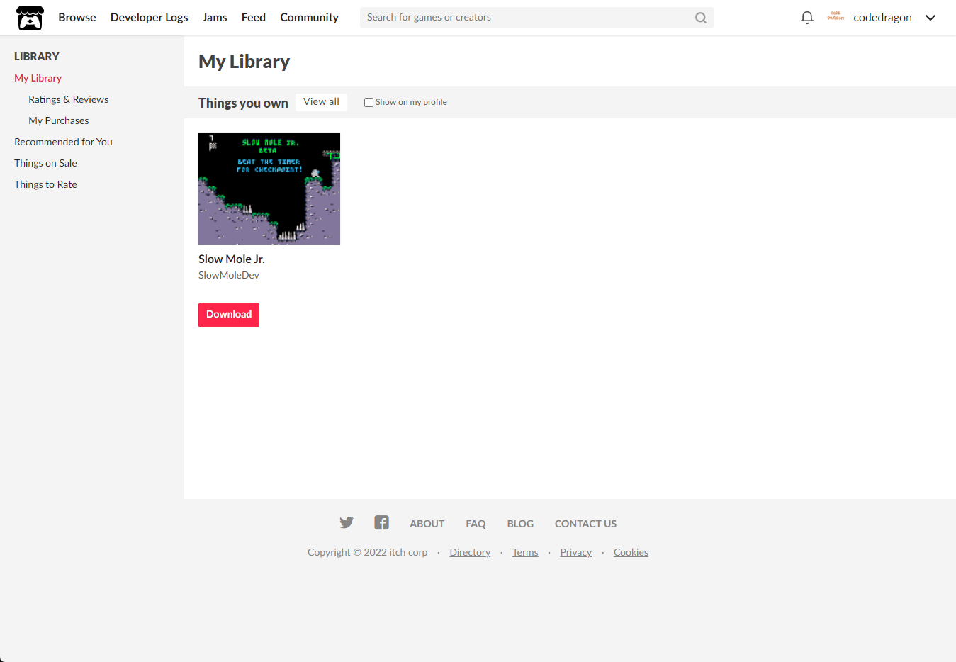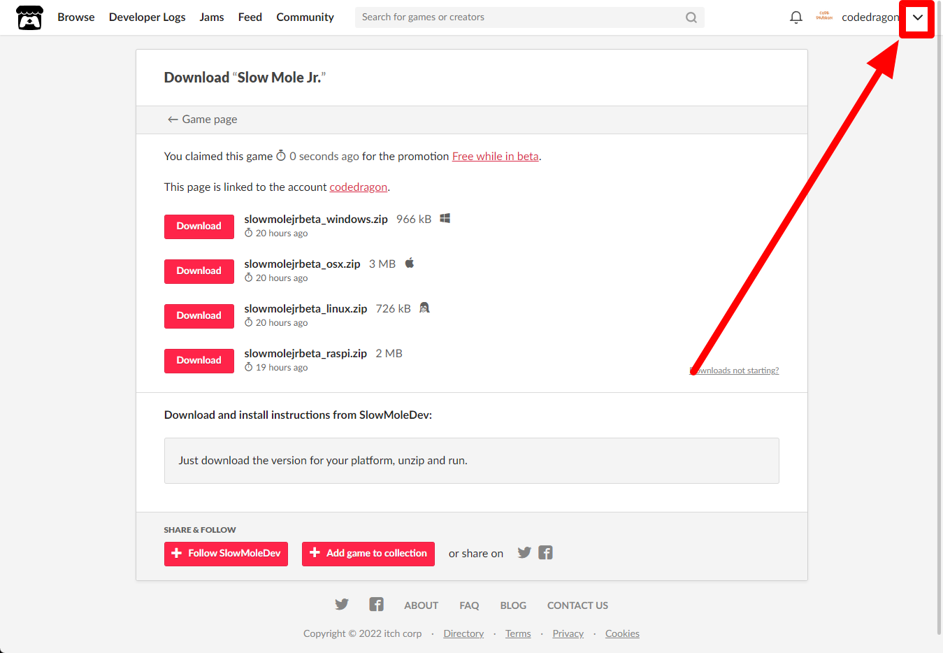 [Claim game]을 클릭하면 "Slow Mole Jr." 게임이 나의 게임 라이브러리에 추가되고 설치파일을 다운받을 수 있는 페이지로 이동됩니다.