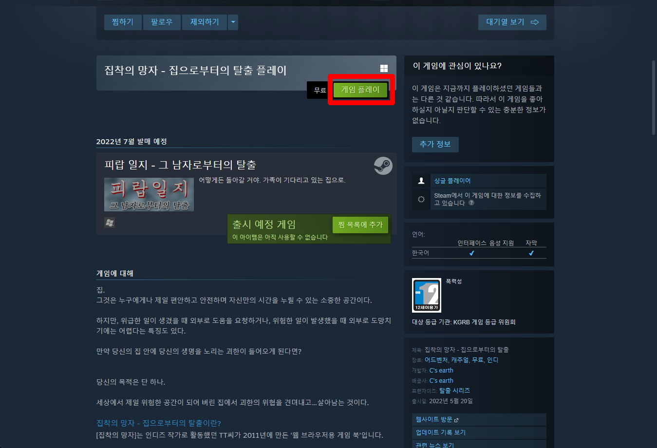 "집착의 망자 - 집으로부터의 탈출" 페이지를 내려 [게임 플레이]를 클릭하면 됩니다.