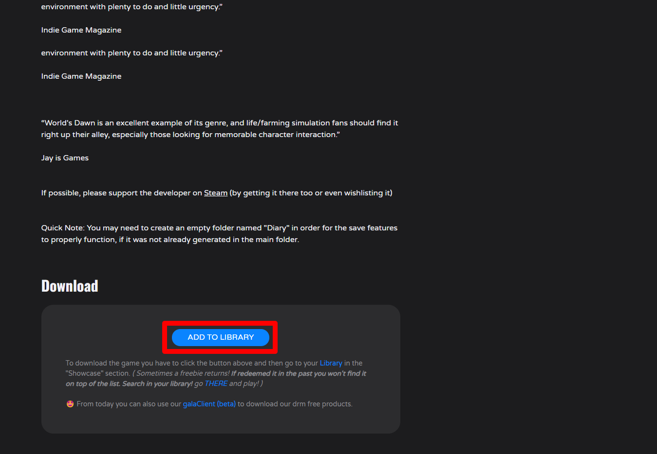 "World's Dawn" 게임 페이지를 내려 [ADD TO LIBRARY]를 클릭합니다.
