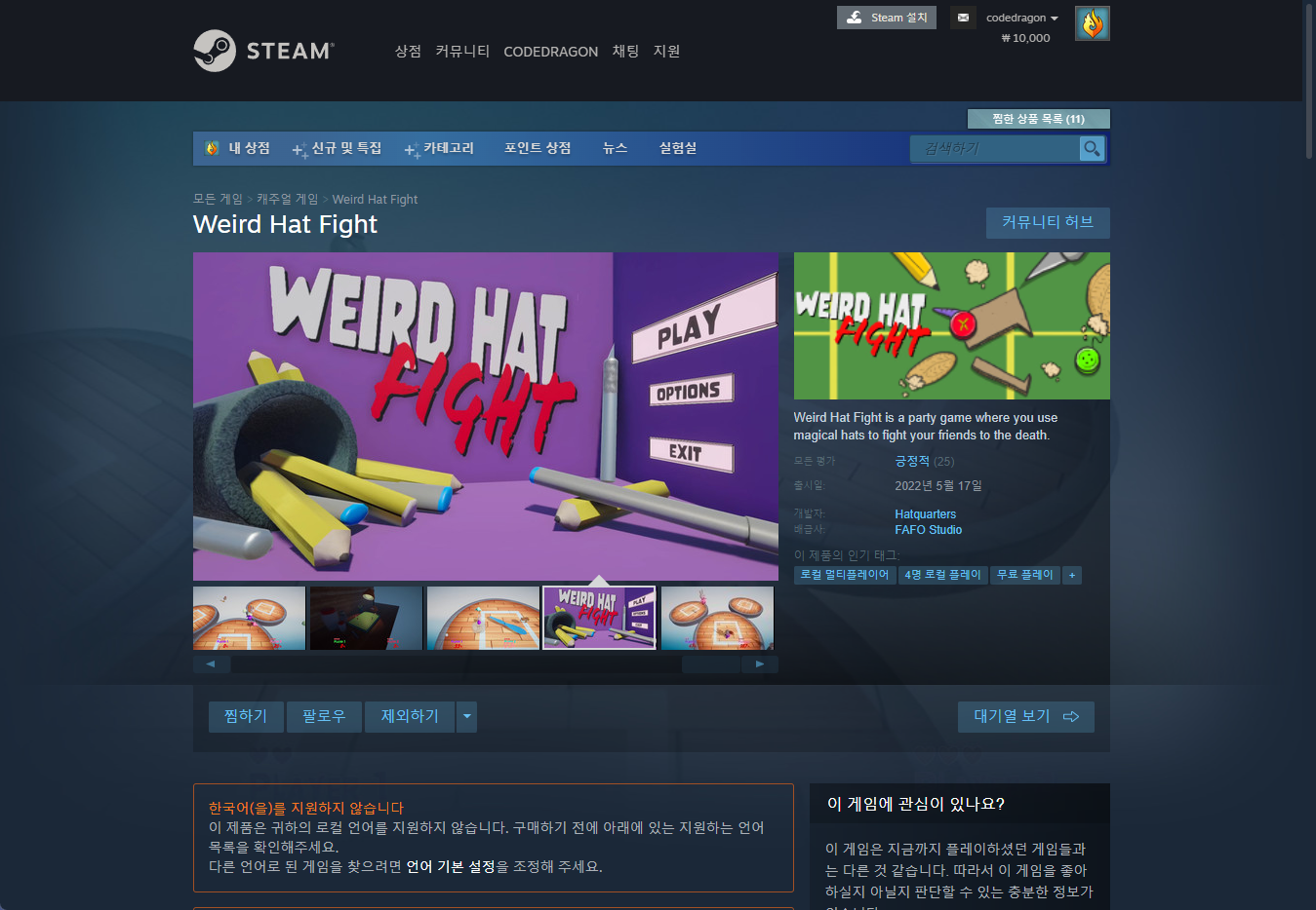 "Weird Hat Fight" 스팀 페이지 입니다.