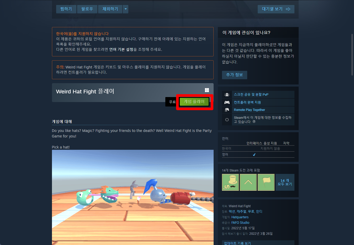 "Weird Hat Fight" 페이지를 내려 [게임 플레이]를 클릭하면 됩니다.