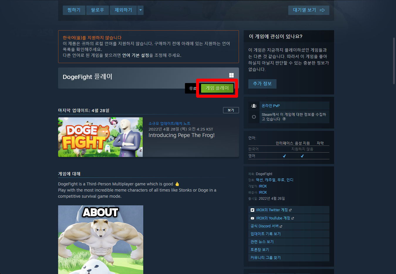 "DogeFight" 페이지를 내려 [게임 플레이]를 클릭하면 됩니다.