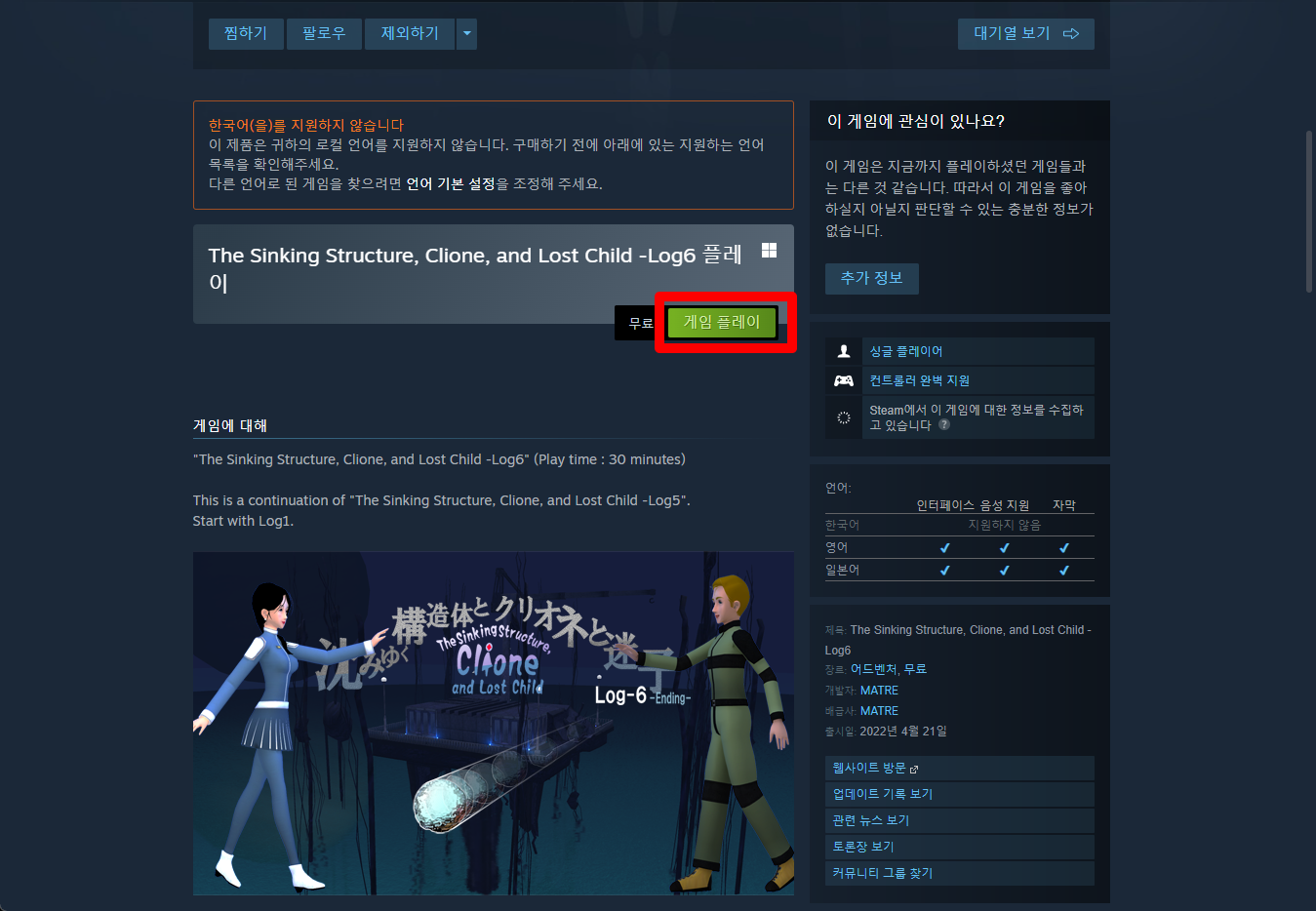 "The Sinking Structure, Clione, and Lost Child -Log6" 페이지를 내려 [게임 플레이]를 클릭하면 됩니다.
