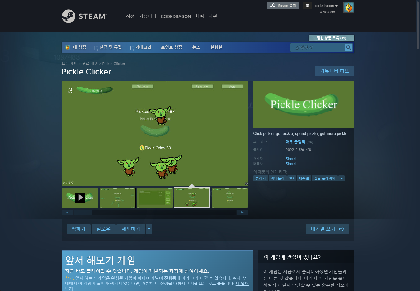 "Pickle Clicker" 스팀 페이지 입니다.