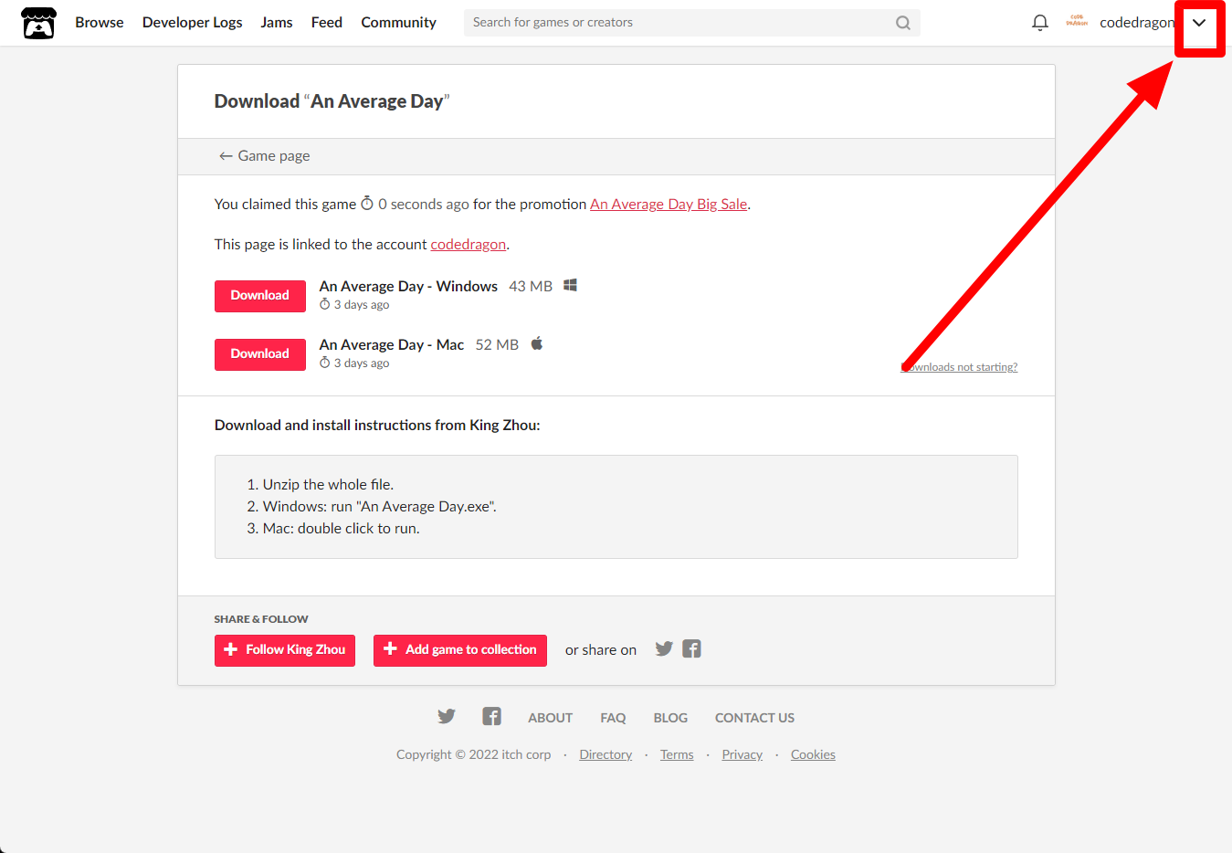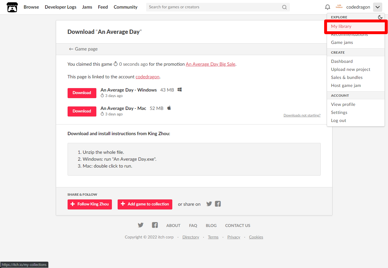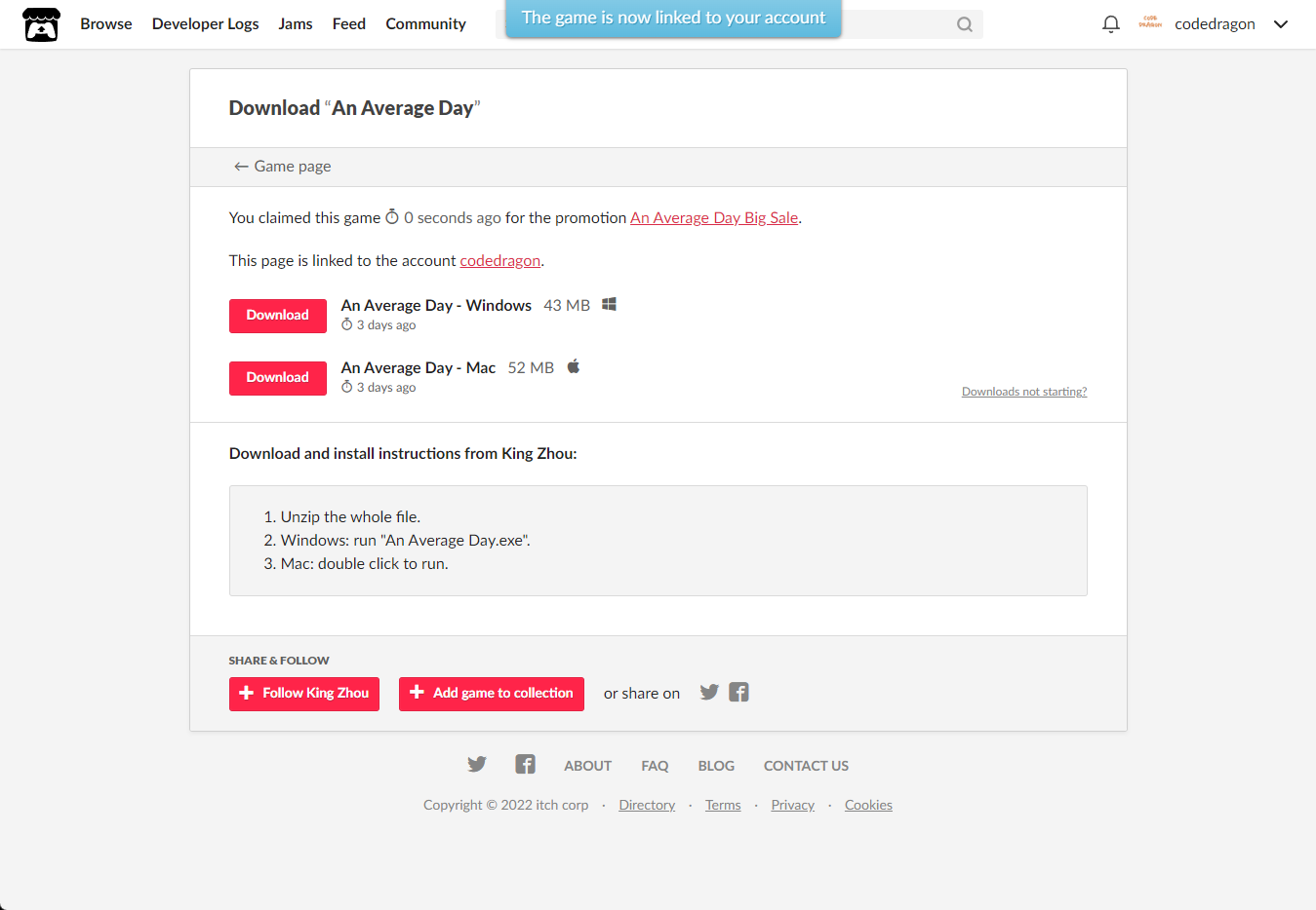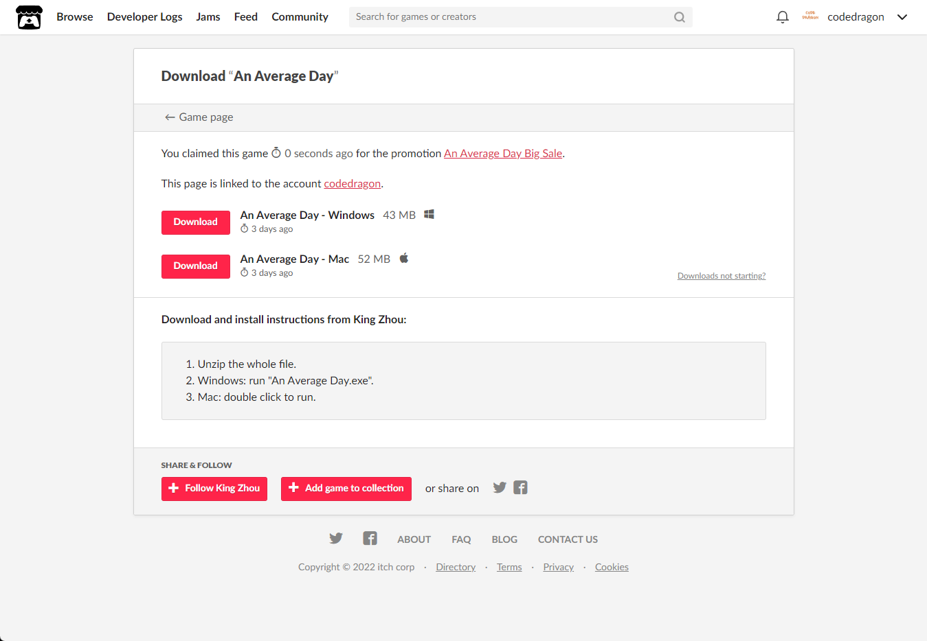 [Claim game]을 클릭하면 "An Average Day" 게임이 나의 게임 라이브러리에 추가되고 설치파일을 다운받을 수 있는 페이지로 이동됩니다.