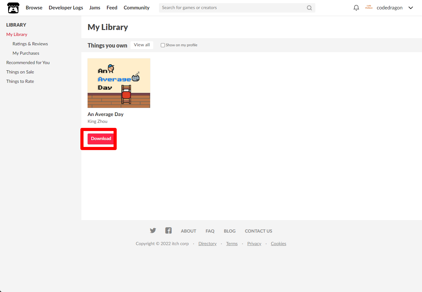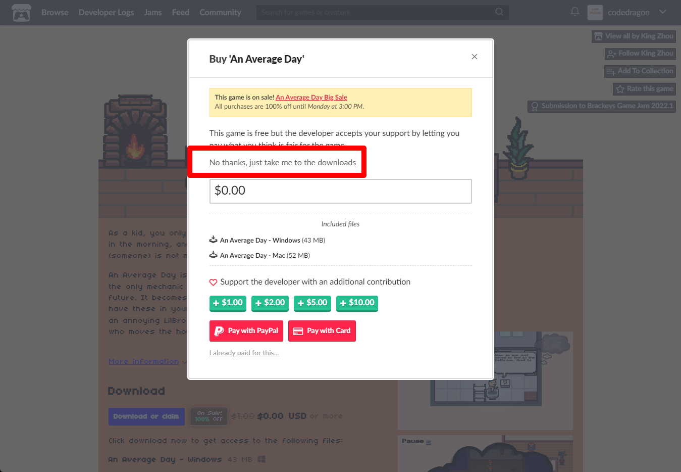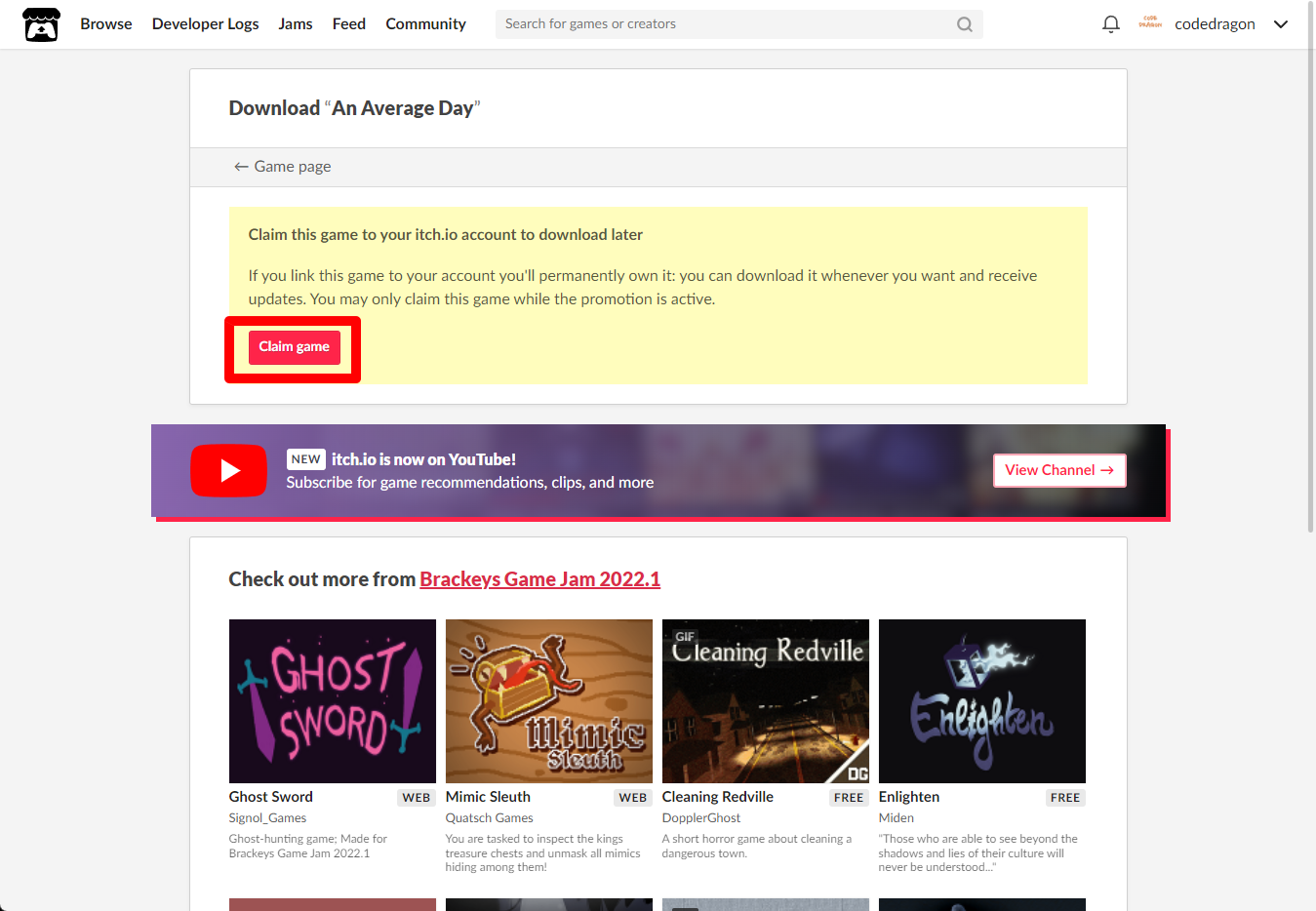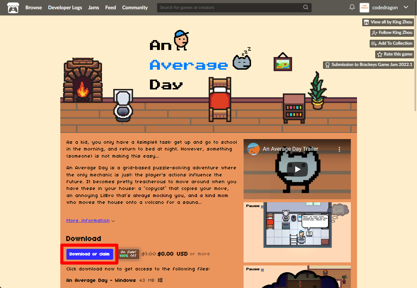 [Claim game]을 클릭하면 "An Average Day" 게임이 나의 게임 라이브러리에 추가되고 설치파일을 다운받을 수 있는 페이지로 이동됩니다.
