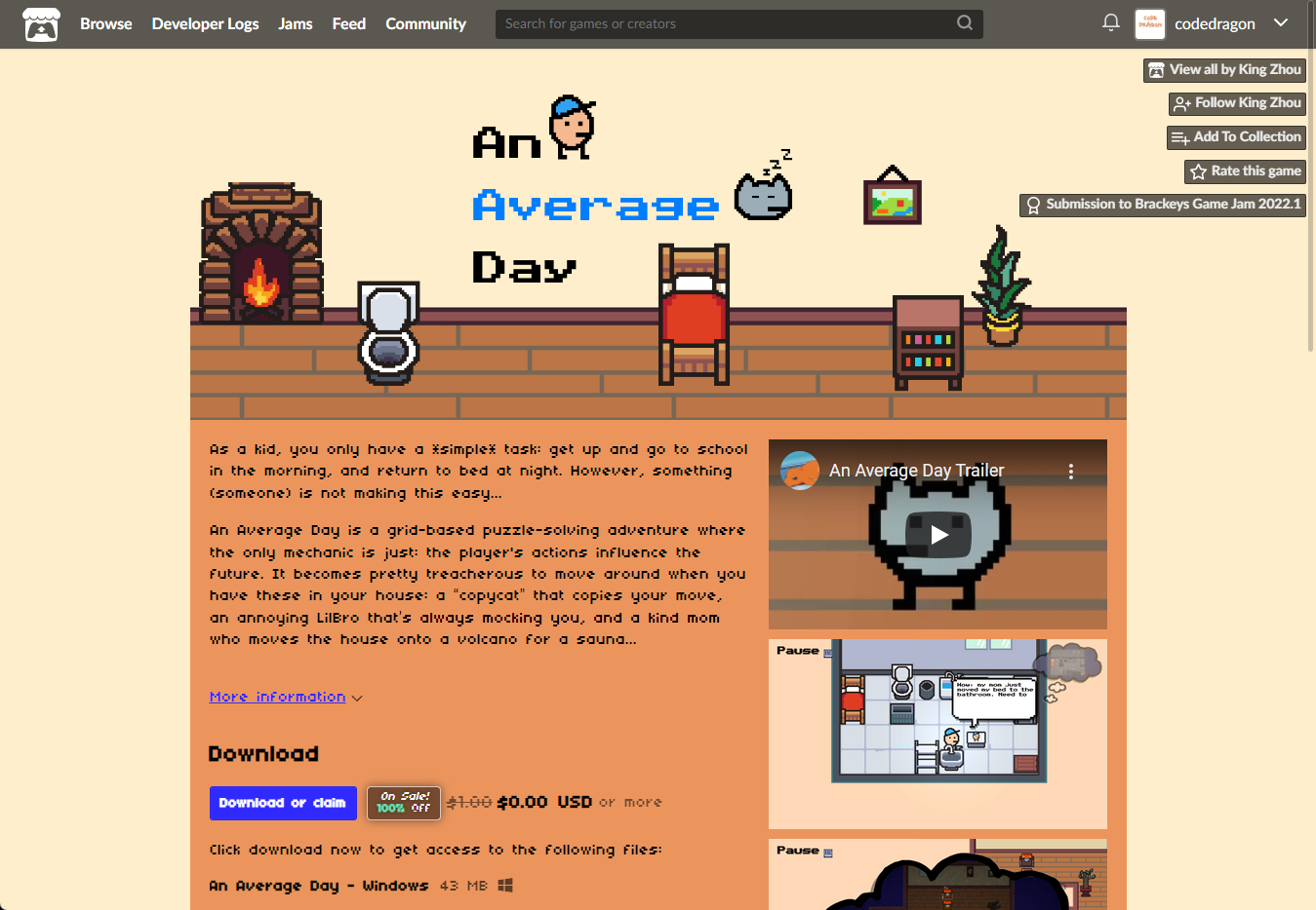 ₩1,273 -> ₩0(Free) An Average Day 언 에버리지 데이 무료로 받기 영구소장 - itch.io 잇치 닷 아이오 한시적 무료 소장하기
