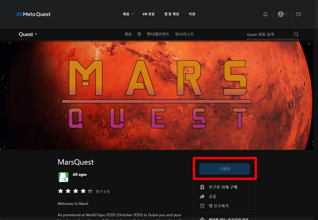 "MarsQuest" 게임 페이지를 보면 "구매함"으로 표시되어 있어 가지고 있는 것 확인할 수 있습니다.