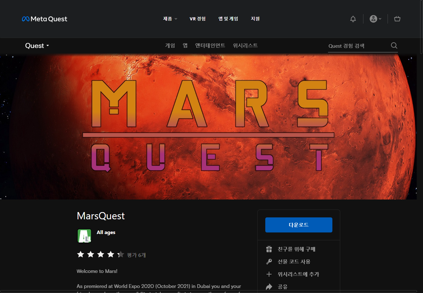 "MarsQuest" 게임페이지에 있는 [다운로드] 버튼 클릭합니다.