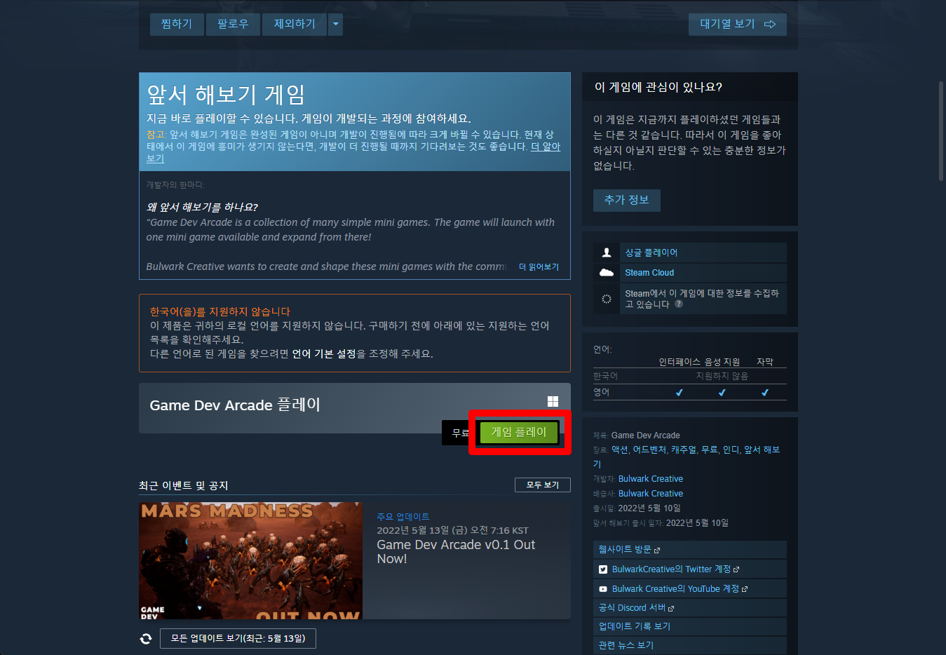 "Game Dev Arcade" 페이지를 내려 [게임 플레이]를 클릭하면 됩니다.