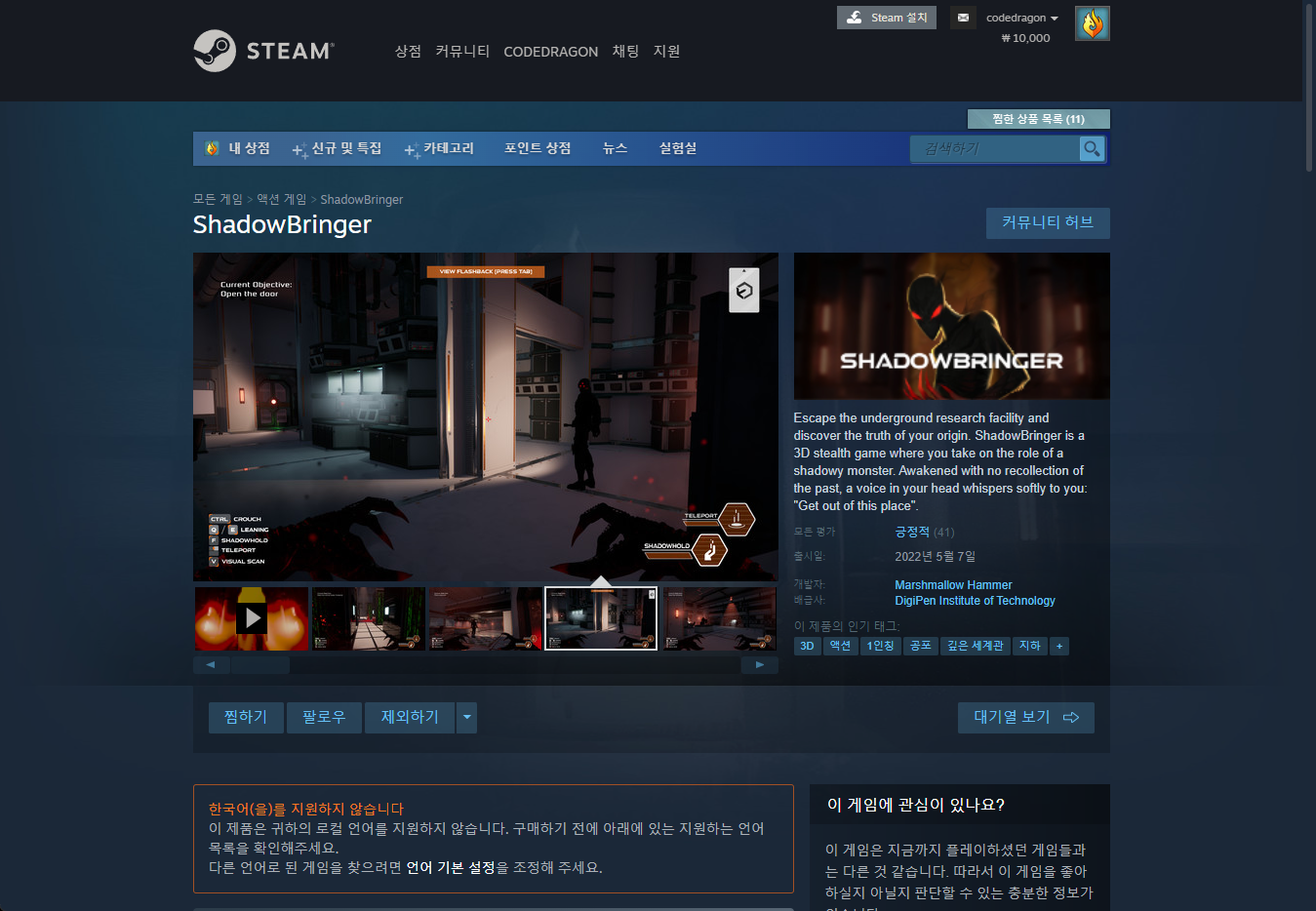 "ShadowBringer" 스팀 페이지 입니다.