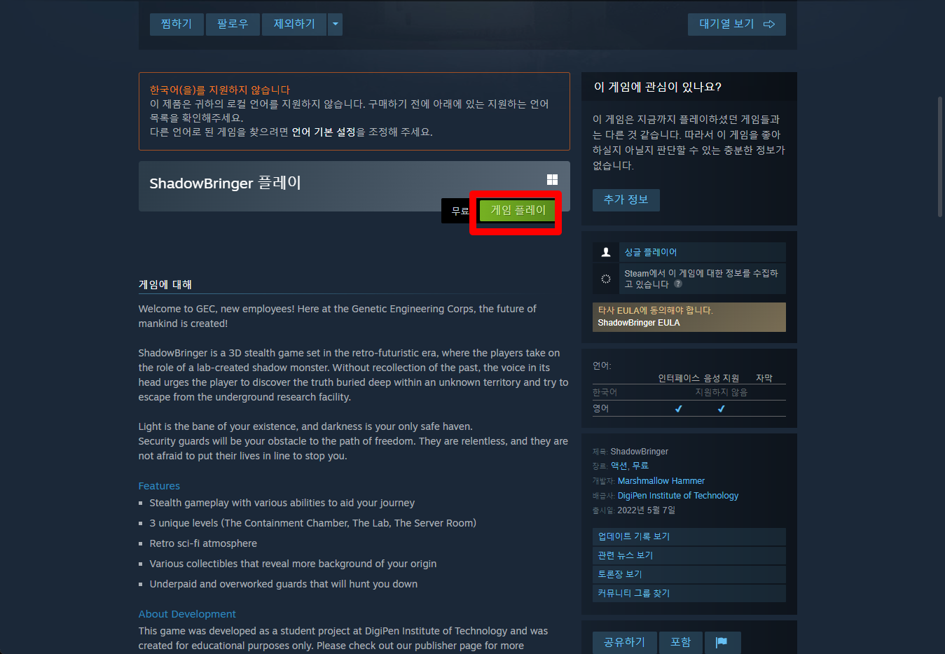 "ShadowBringer" 페이지를 내려 [게임 플레이]를 클릭하면 됩니다.