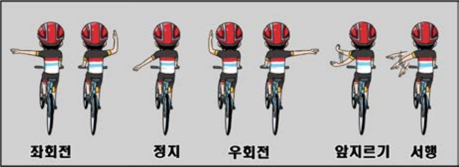 | 정지 | 팔을 차체의 밖으로 내어 45도 밑으로 펴기 제동등 점등 (영화에서 처럼) 팔을 차체 밖으로 내어 팔꿈치를 굽혀 수직으로 주먹을 쥐어줍니다. |