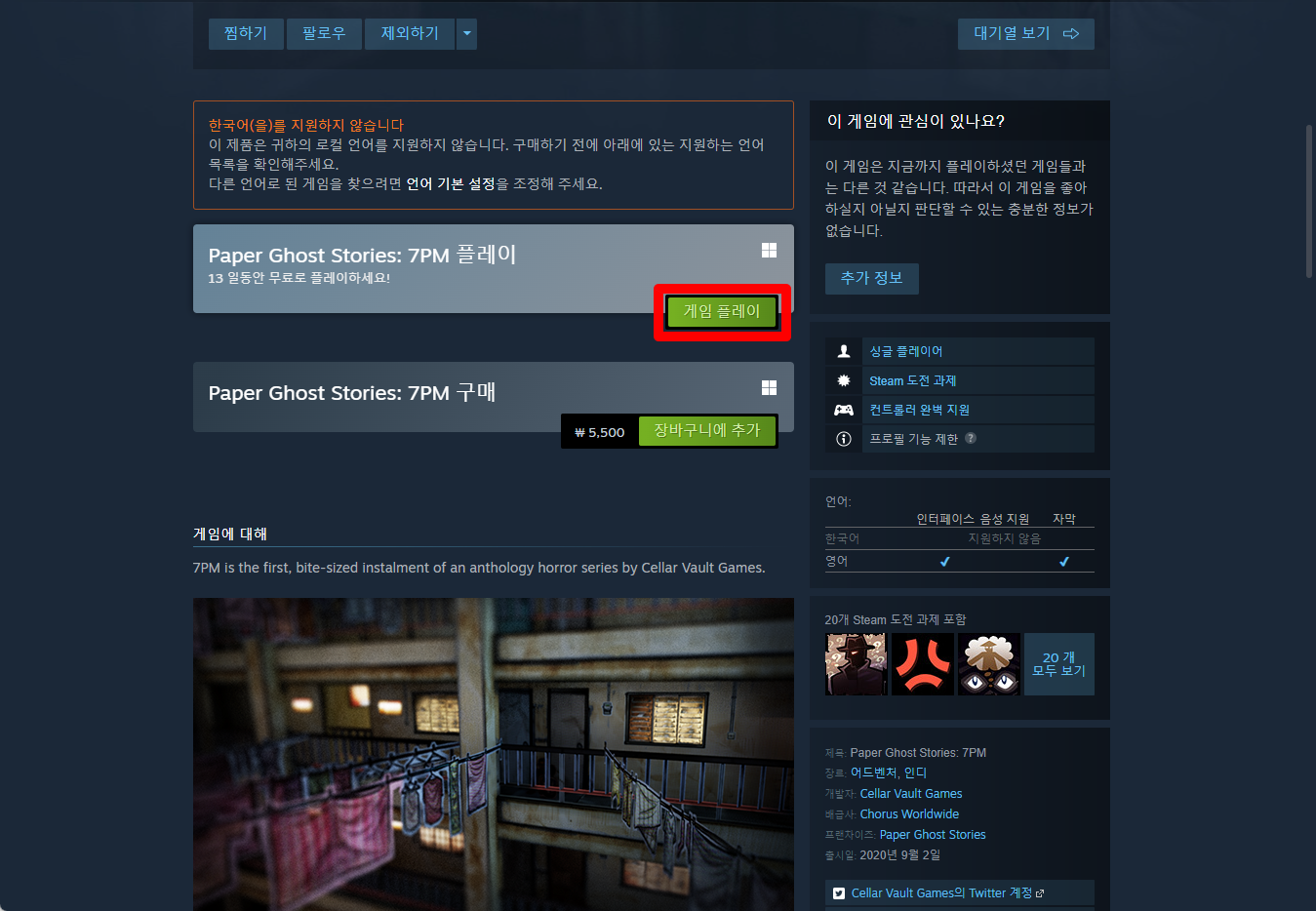 "Paper Ghost Stories: 7PM" 게임페이지를 조금 내려서 [게임 플레이] 버튼을 클릭하면 됩니다.