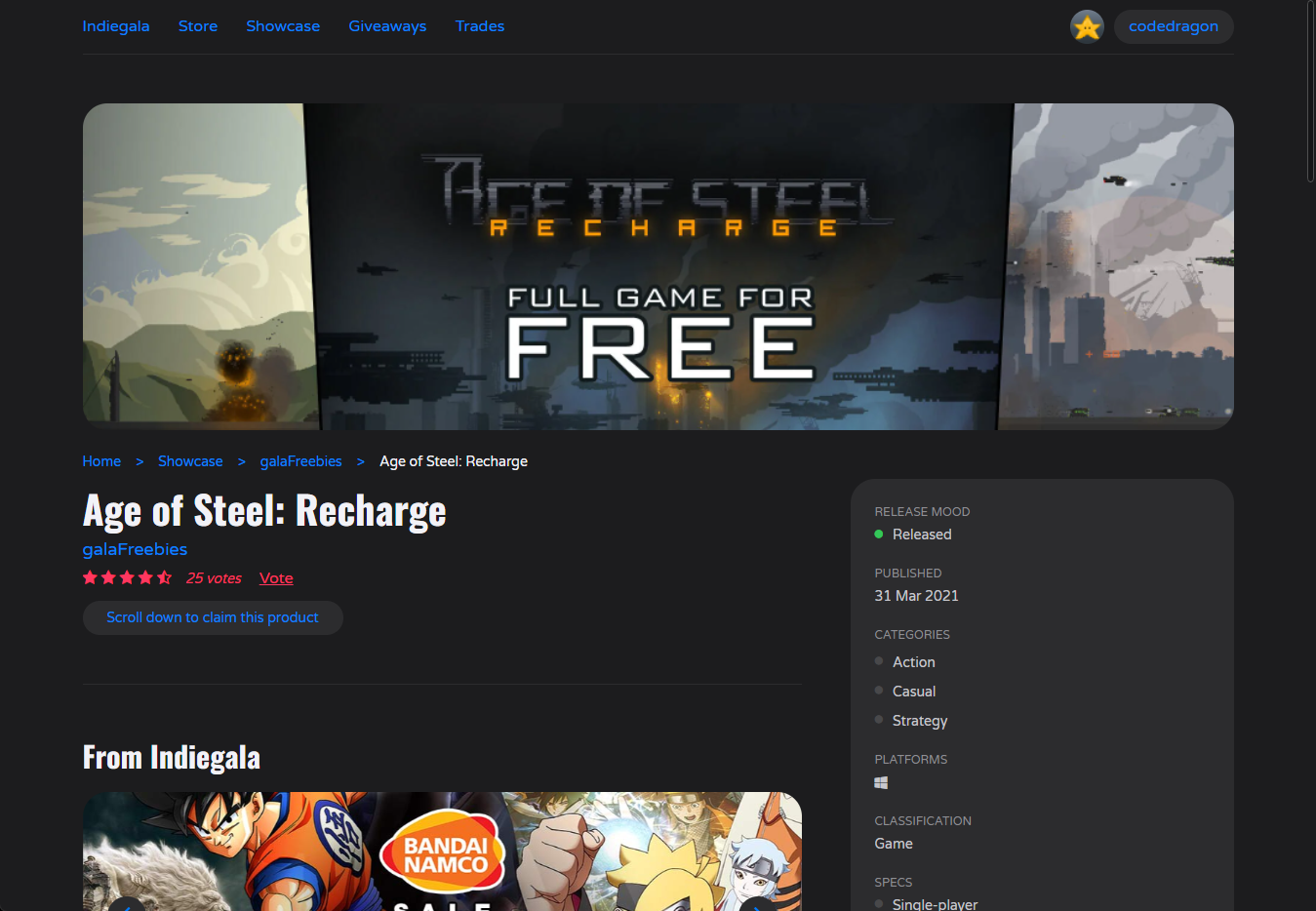 ₩7,500 -> ₩ 0(Free) Age of Steel: Recharge 에이지 오브 스틸: 리차지 무료 - 인디갈라 indiegala 무료 소장 기회 기간한정 indiegala FREE GAME, Limited time