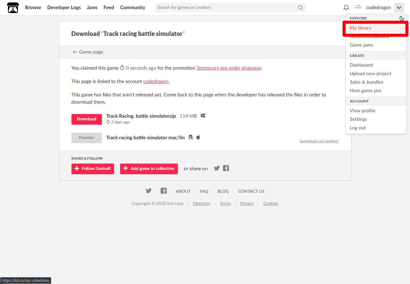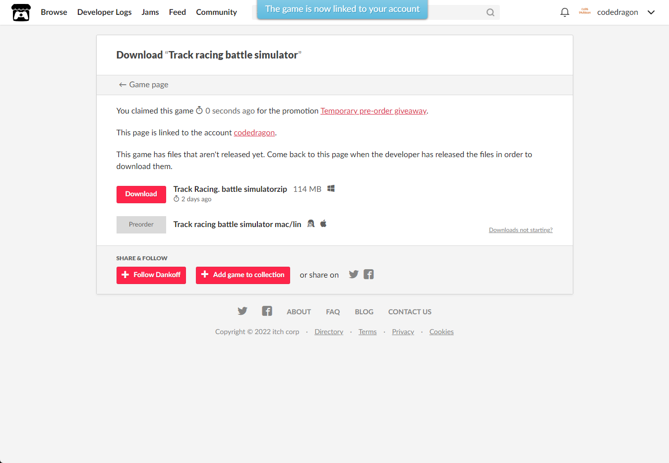 [Claim game]을 클릭하면 "Track racing battle simulator" 게임이 나의 게임 라이브러리에 추가되고 설치파일을 다운받을 수 있는 페이지로 이동됩니다.