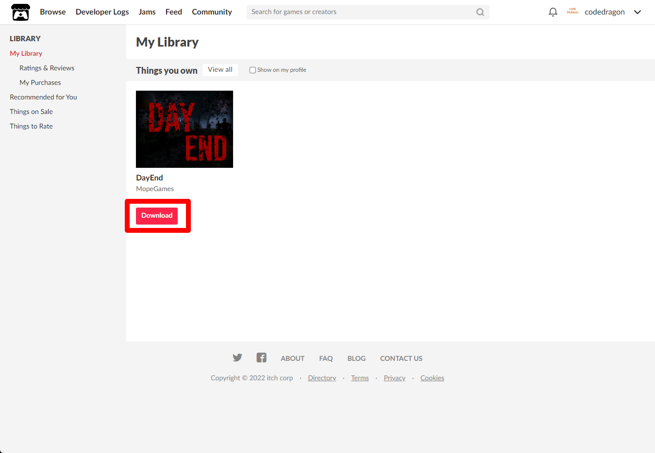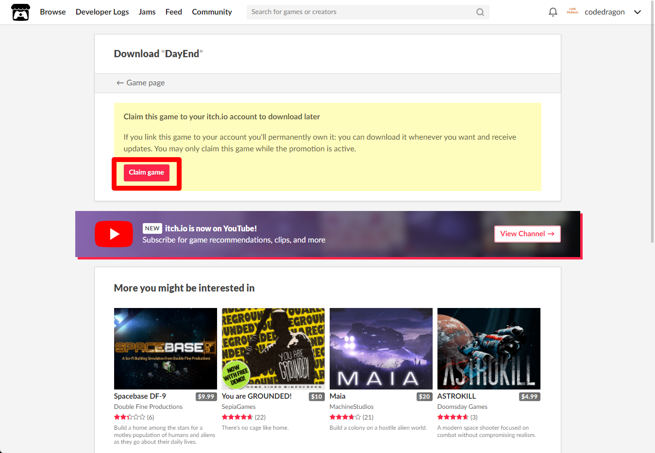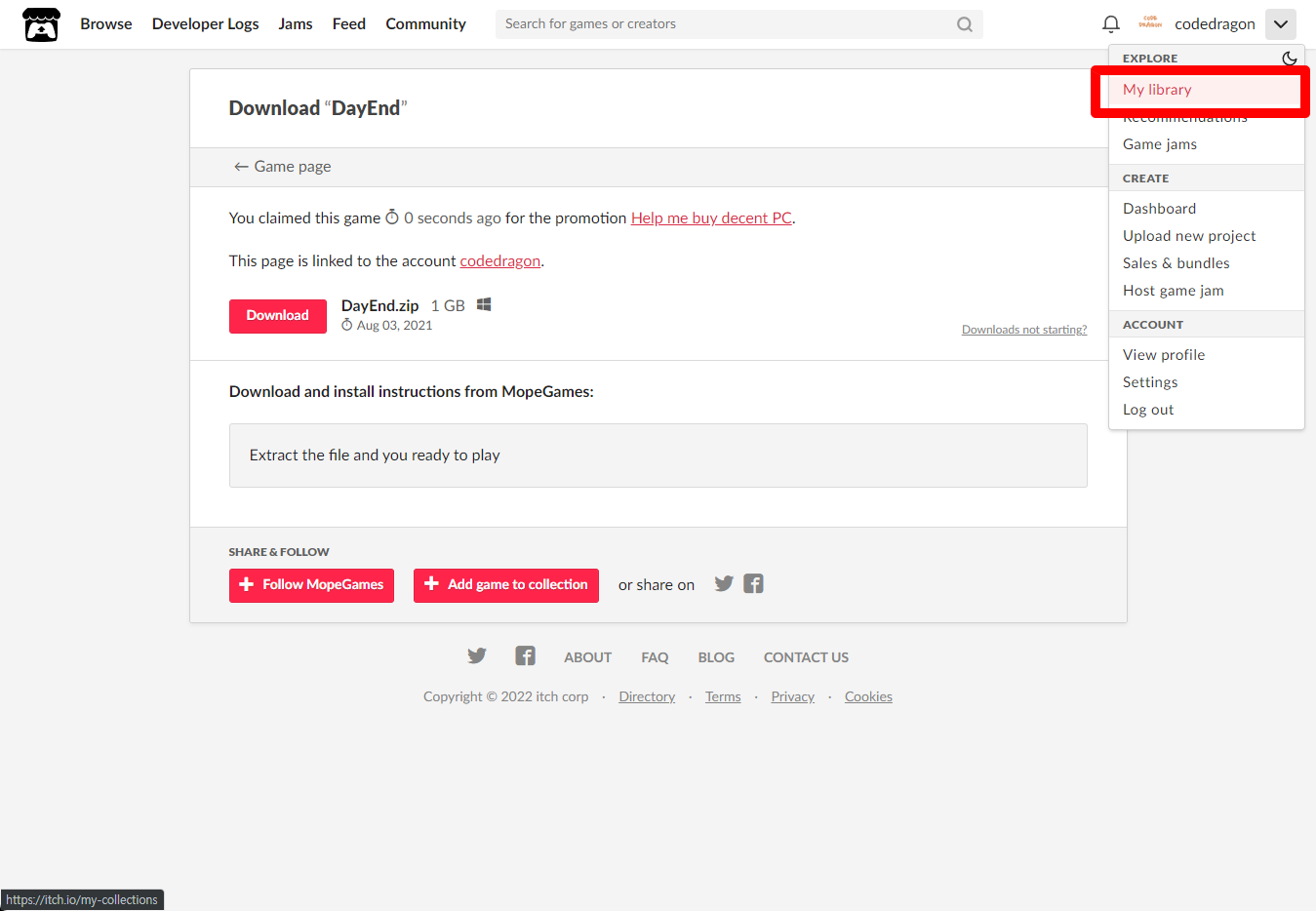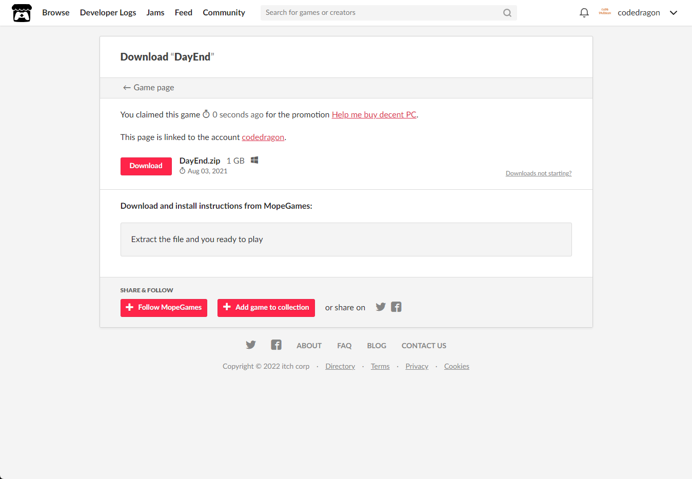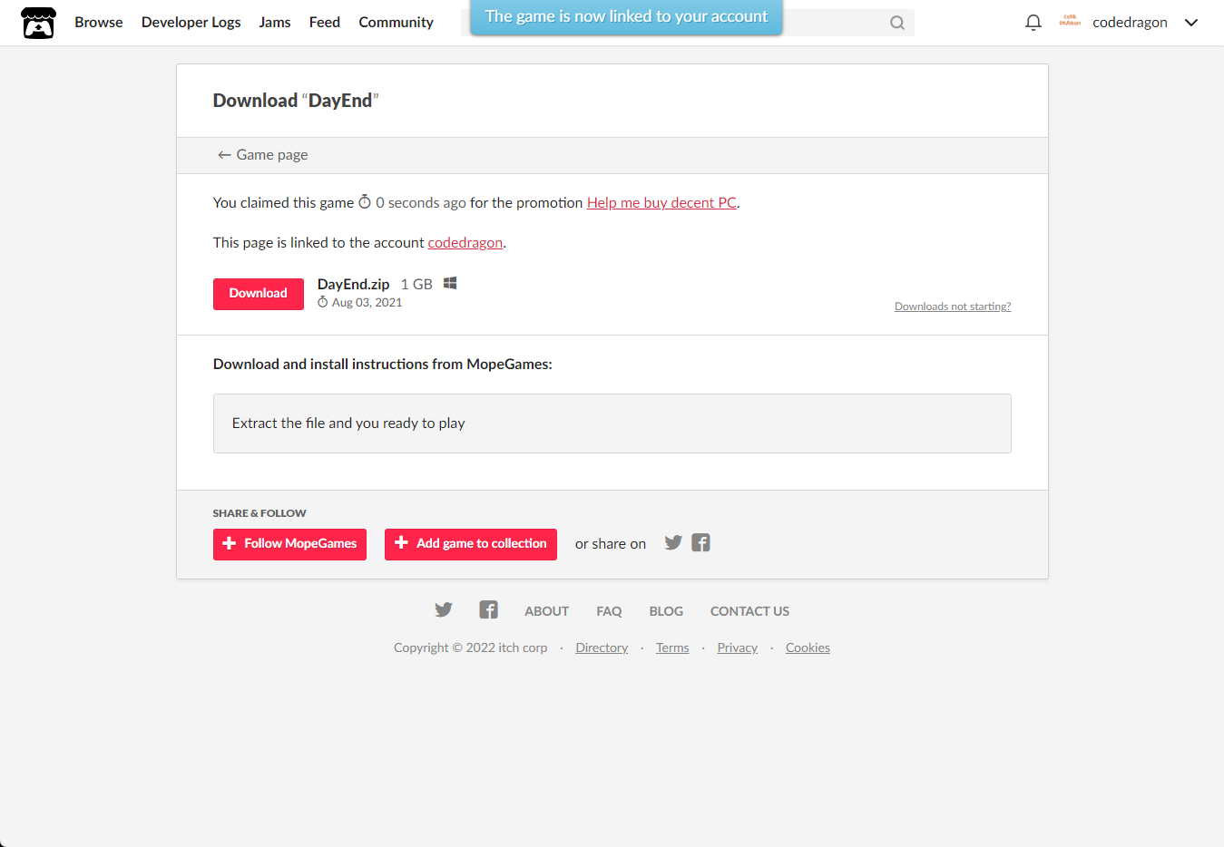 [Claim game]을 클릭하면 "DayEnd" 게임이 나의 게임 라이브러리에 추가되고 설치파일을 다운받을 수 있는 페이지로 이동됩니다.