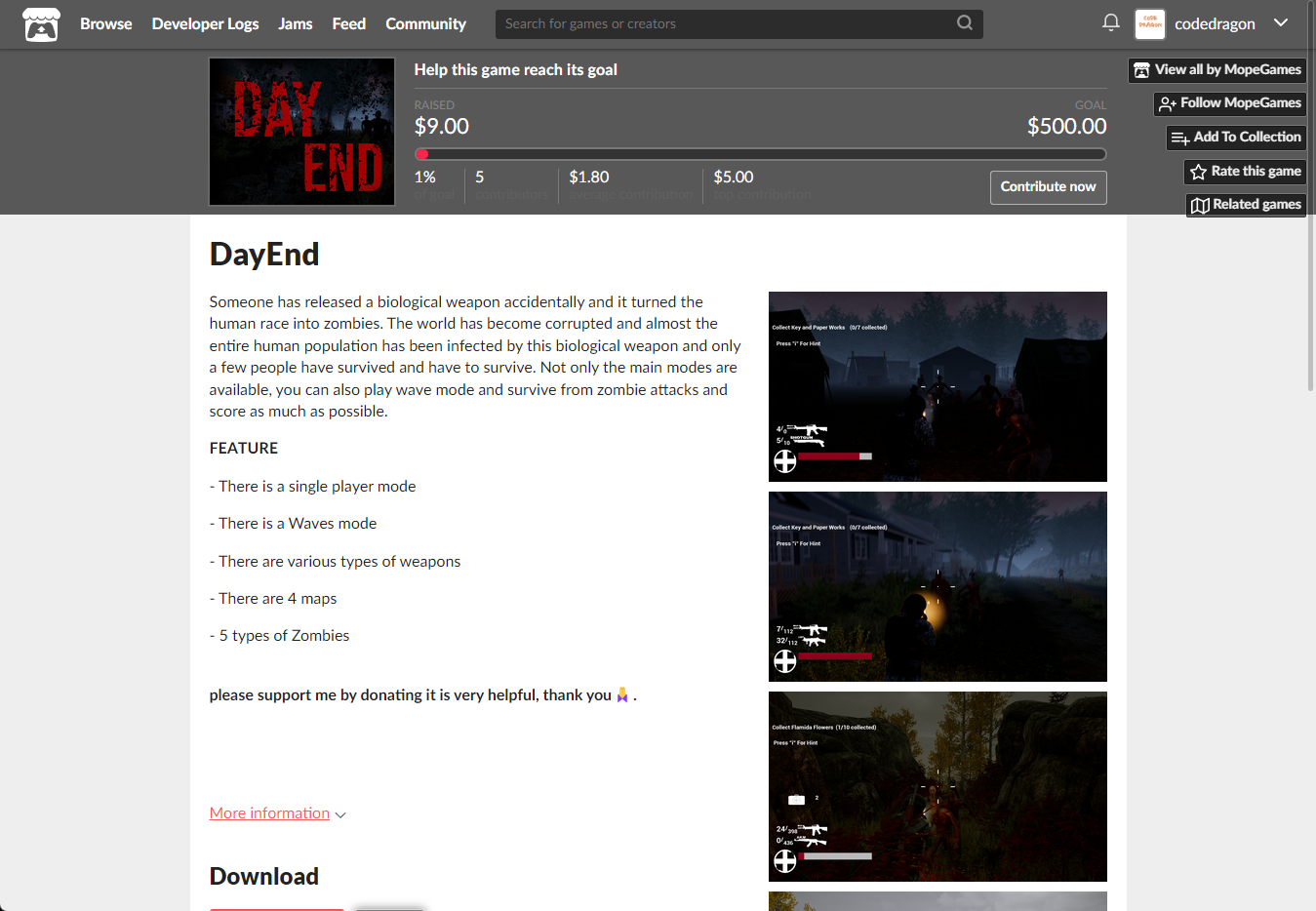 "DayEnd" 해당 항목에 있는 [Download] 버튼을 클릭하면 게임의 설치파일을 다운받을 수 있습니다.