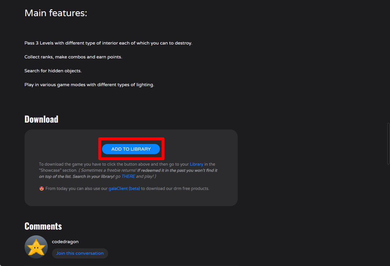 "Fly in the House" 게임 페이지를 내려 [ADD TO LIBRARY]를 클릭합니다.