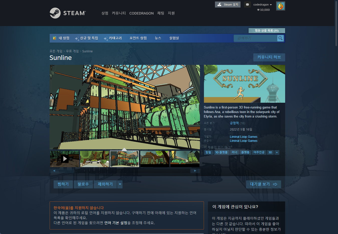 "Sunline" 스팀 페이지 입니다.