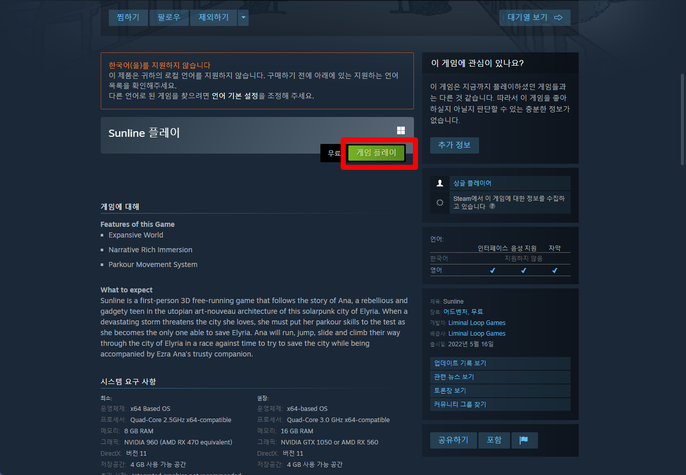 "Sunline" 페이지를 내려 [게임 플레이]를 클릭하면 됩니다.