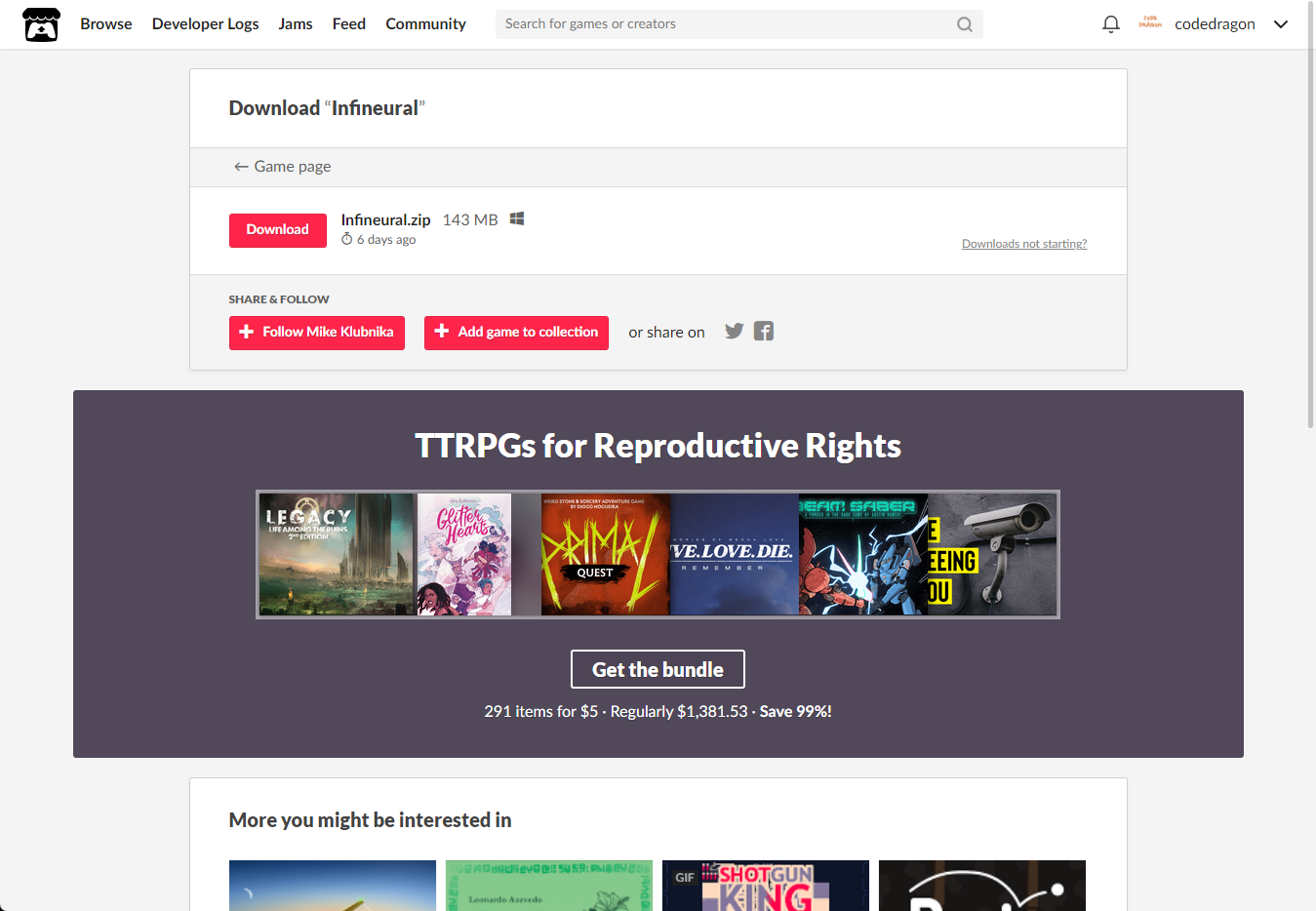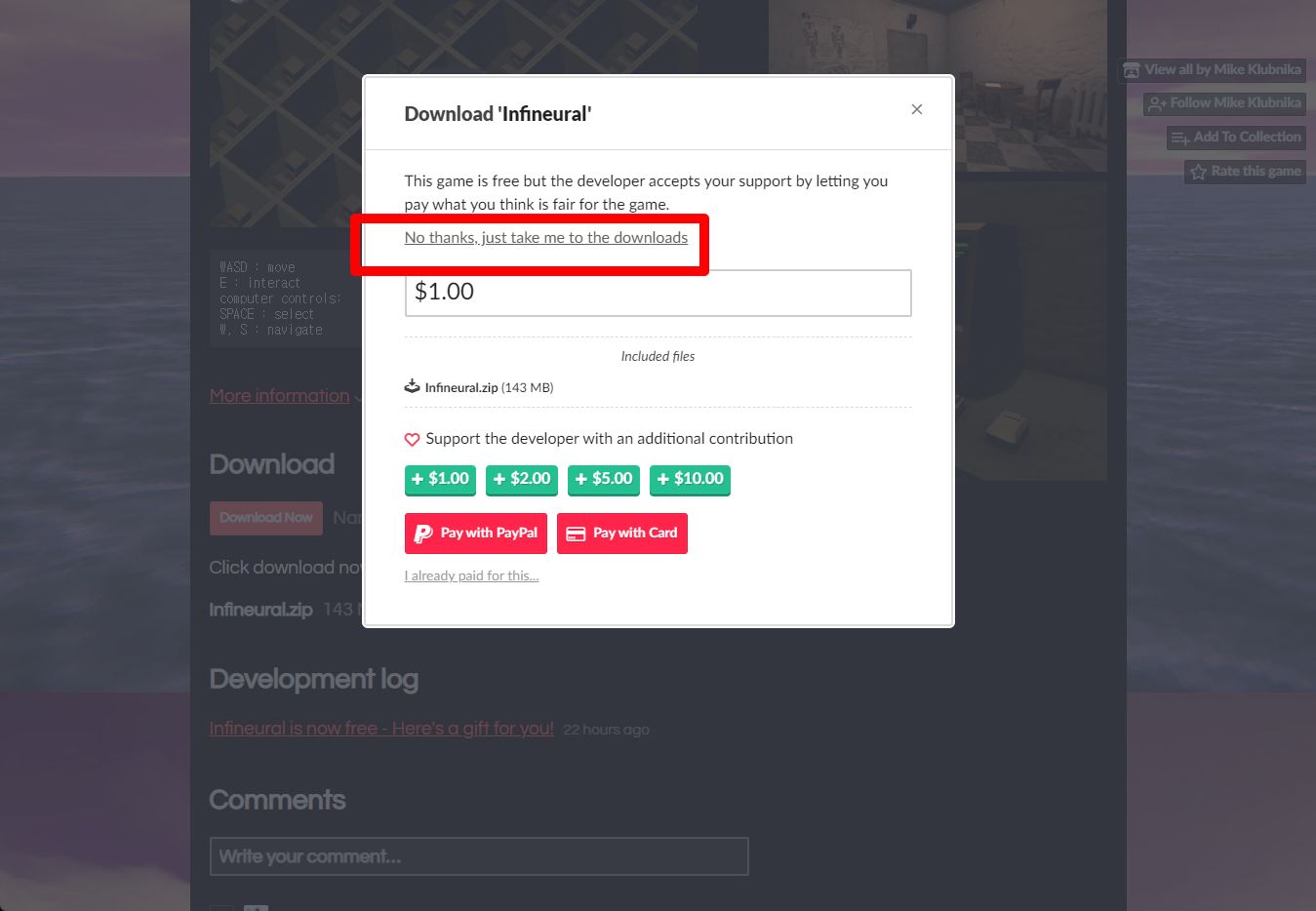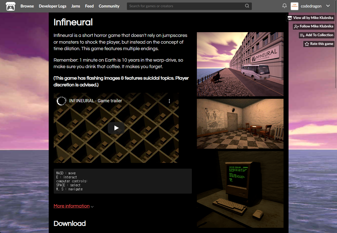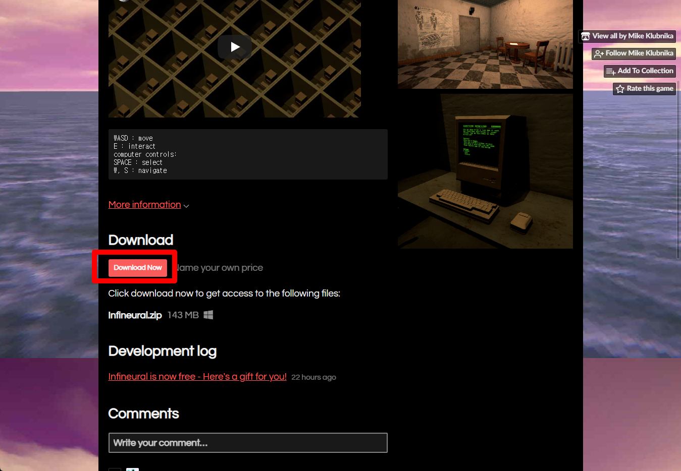 "Infineural" 해당 항목에 있는 [Download] 버튼을 클릭하면 게임의 설치파일을 다운받을 수 있습니다.