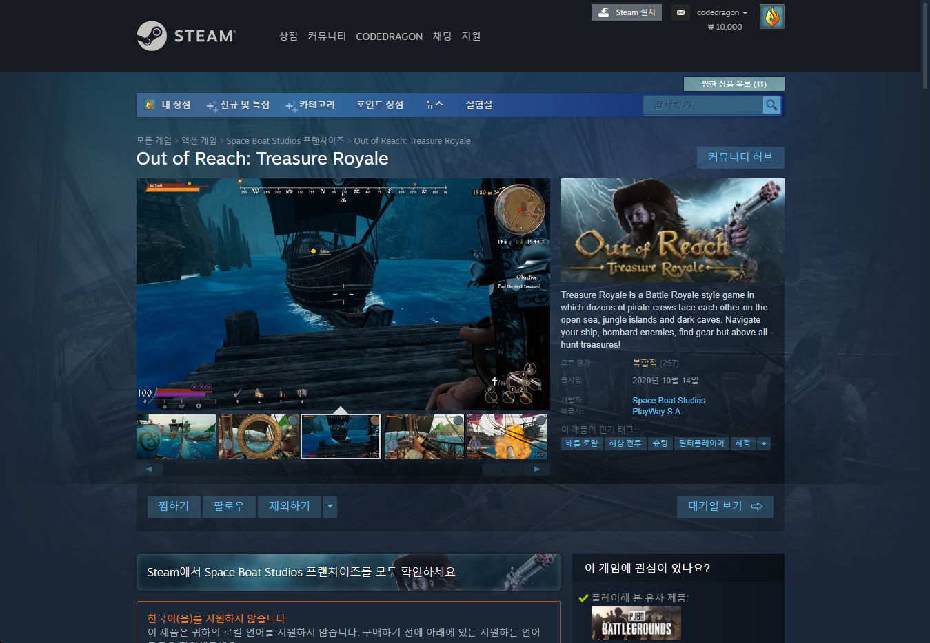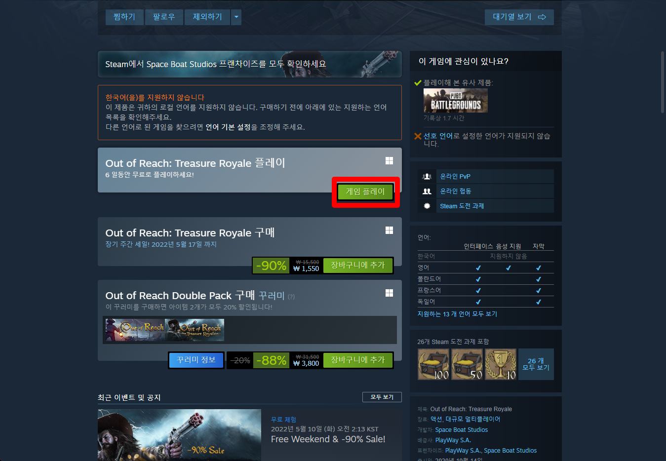 "Out of Reach: Treasure Royale" 게임페이지를 조금 내려서 [게임 플레이] 버튼을 클릭하면 됩니다.