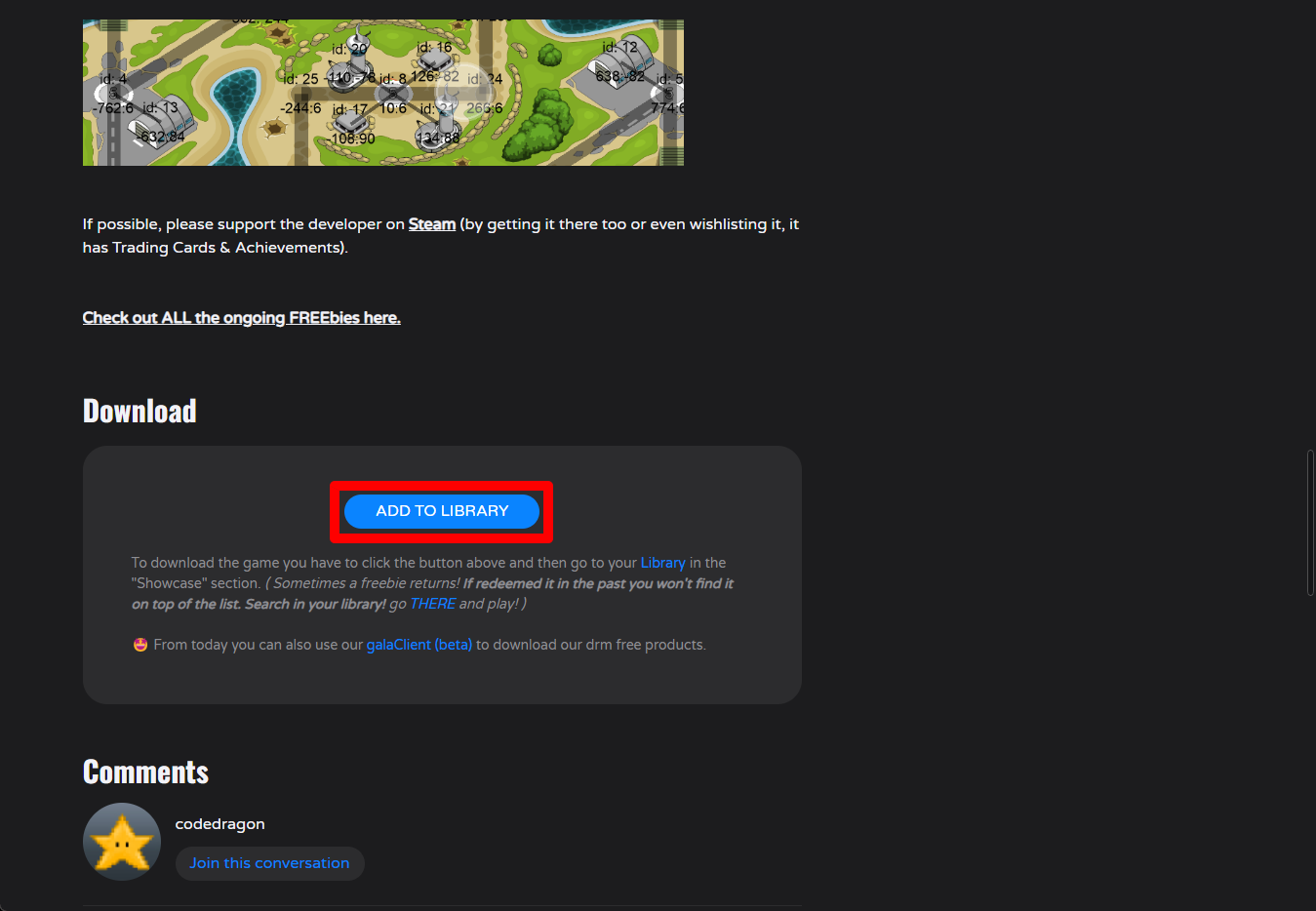 "ConflictCraft" 게임 페이지를 내려 [ADD TO LIBRARY]를 클릭합니다.