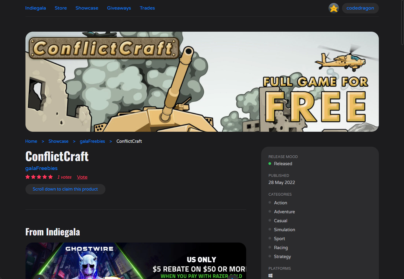 ₩5,500 -> ₩ 0(Free) ConflictCraft 컨플릭트크래프트 무료 - 인디갈라 indiegala 무료 소장 기회 기간한정 indiegala FREE GAME, Limited time