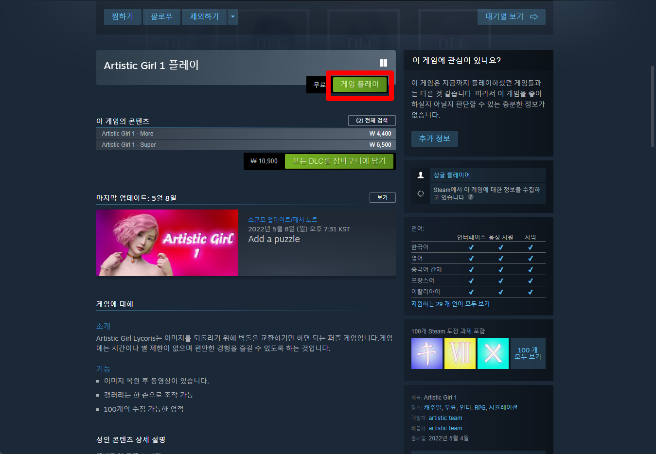 "Artistic Girl 1" 페이지를 내려 [게임 플레이]를 클릭하면 됩니다.